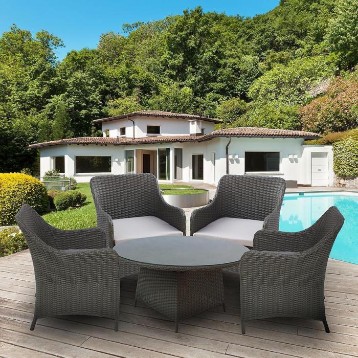 Technorattanowy okragły stół idealnie wpasuje się w kompozycje każdego balkonu, tarasu czy ogrodu. Jego nowoczesny design przypadnie do gustu każdemu. Stół posiada przyssawki, co zapewnia, że blat jest stabilny i nie przesuwa się. Konstrukcja stołu to aluminium, a blat wykonany jest ze szkła hartowanego.