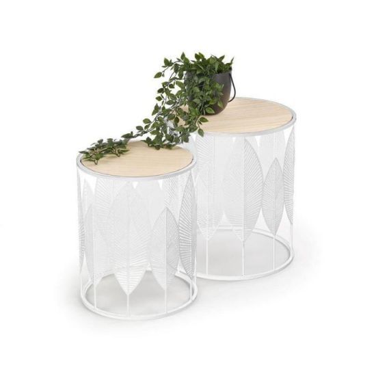 Okrągłe stoliki Zola wniosą do wybranego wnętrza funkcjonalność połączoną z aspektem wysokiej estetyki. Okrągłe blaty stworzono z płyty MDF okleinowej, a następnie wykończono je w odcieniu naturalnym. Stabilna podstawa stolików o okrągłej konstrukcji z dekoracyjnymi grafikami w kształcie piór lub liści wykonana jest ze stali malowanej proszkowo na kolor biały. Odmiennych rozmiarów stoliki można wykorzystać razem lub osobno — świetnie sprawdzą się w formie stolików kawowych lub stolików pomocniczych, na których wyeksponujemy atrakcyjne dekoracje lub zielone rośliny doniczkowe.