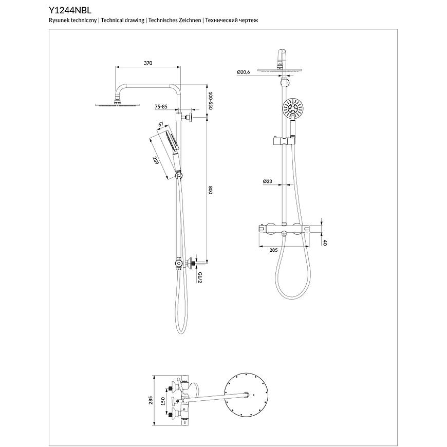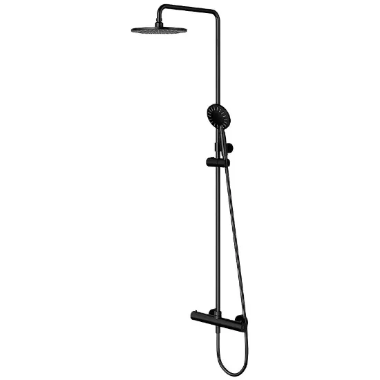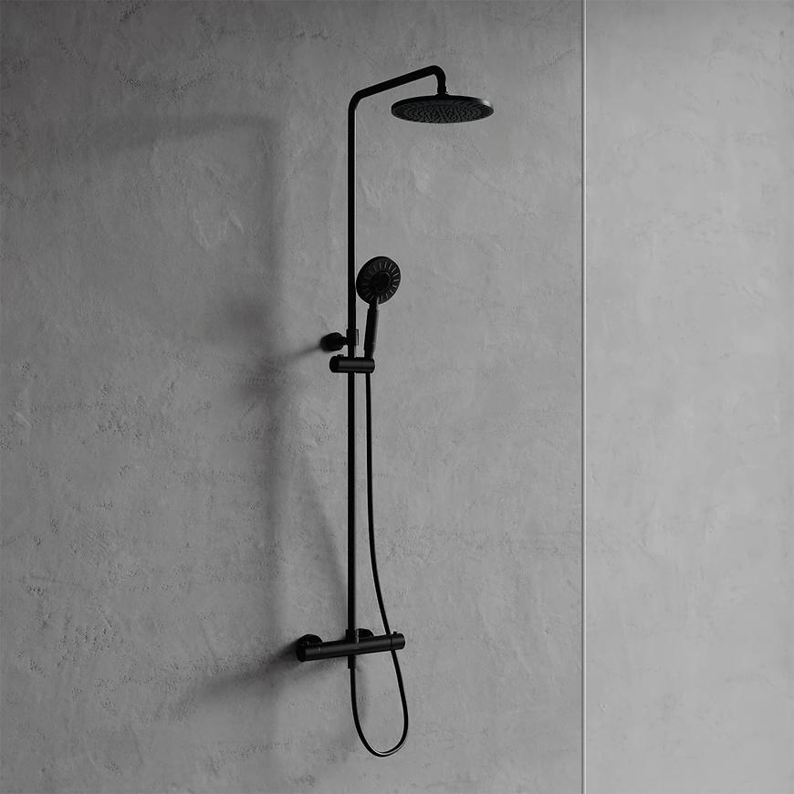 System natryskowy Uni w kolorze czarnym matowym z deszczownicą i baterią termostatyczną to eleganckie i nowoczesne rozwiązanie do łazienki. Zapewnia precyzyjną kontrolę temperatury, komfort kąpieli i stylowy wygląd, idealny do minimalistycznych, loftowych lub industrialnych wnętrz.