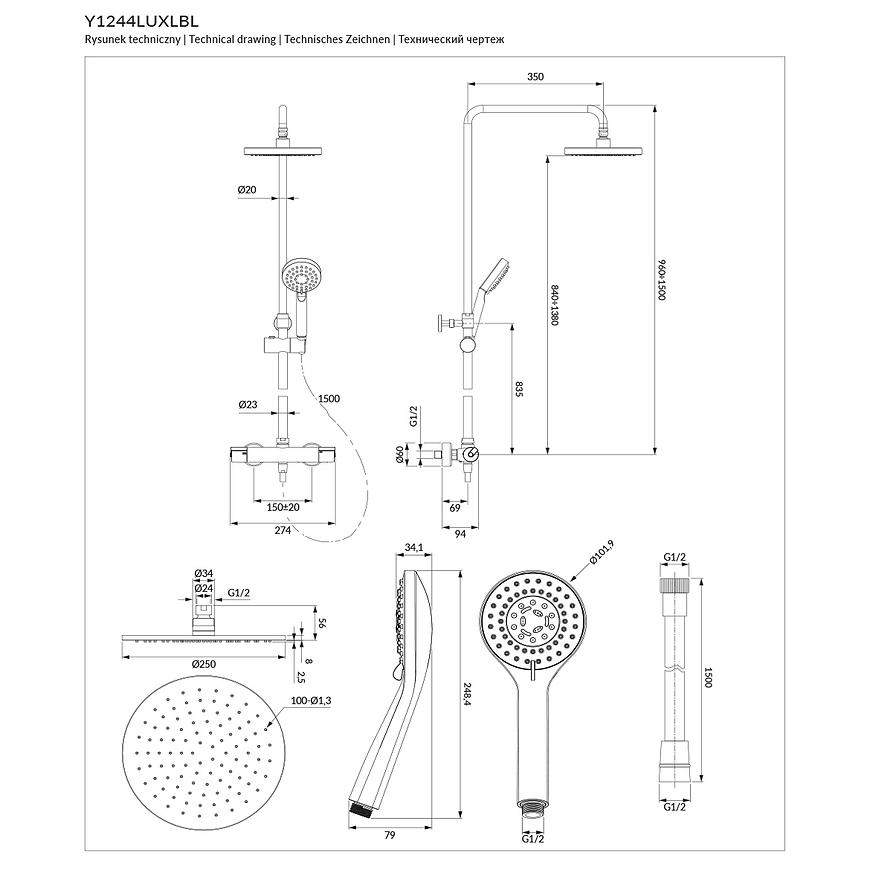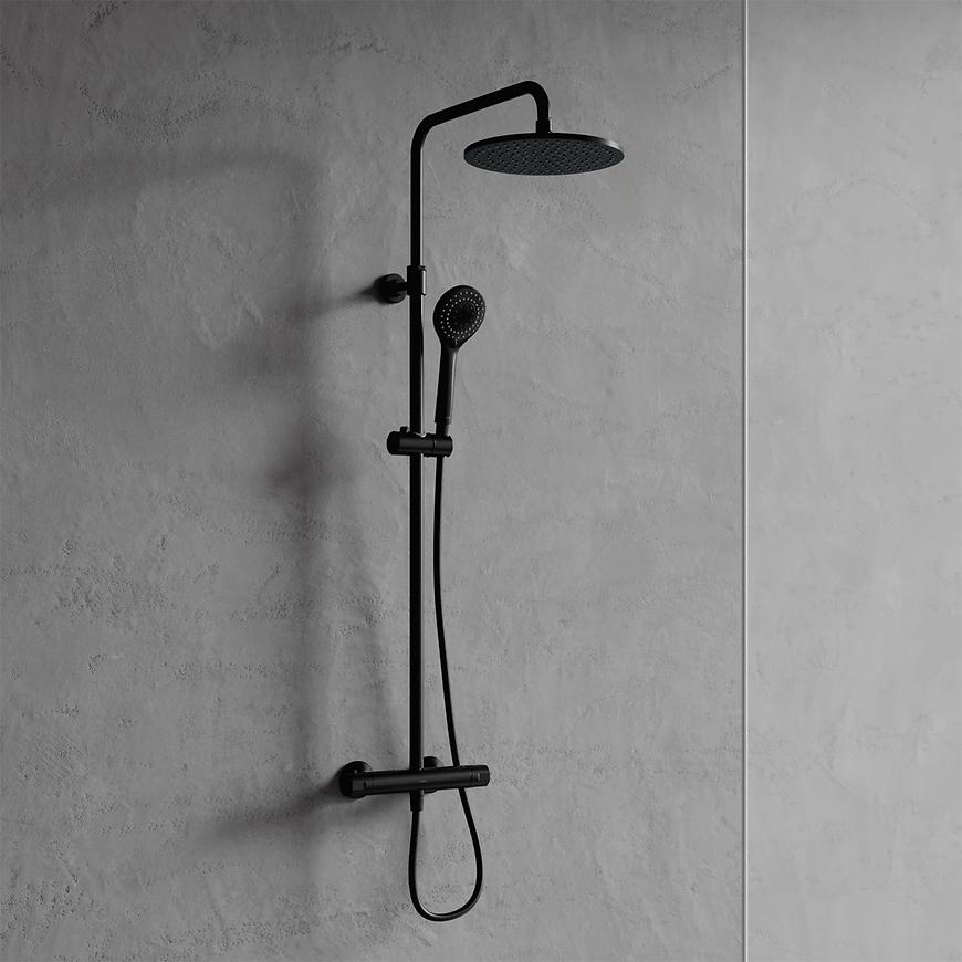 System natryskowy Y w kolorze czarnym z deszczownicą i baterią termostatyczną to stylowe i funkcjonalne rozwiązanie do nowoczesnej łazienki. Zapewnia wygodną regulację temperatury, równomierny strumień wody i elegancki, matowy wygląd.