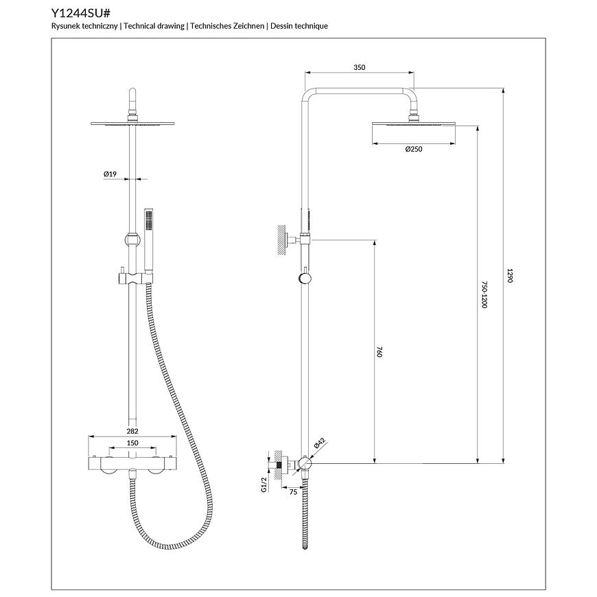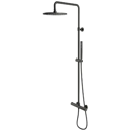 System natryskowy Y w kolorze grafitowym z deszczownicą i baterią termostatyczną to nowoczesne rozwiązanie do łazienki. Zapewnia komfortową kąpiel, precyzyjną regulację temperatury i elegancki, matowy wygląd.