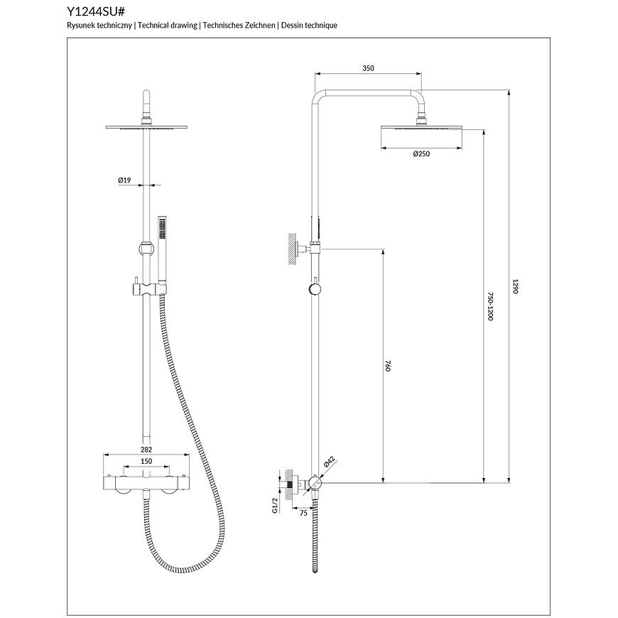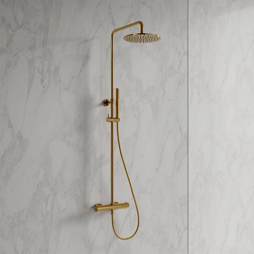 System natryskowy Y w kolorze złotym z deszczownicą i baterią termostatyczną to luksusowy akcent w nowoczesnej łazience. Łączy elegancki design z funkcjonalnością, oferując wygodną regulację temperatury i relaksujący strumień wody.