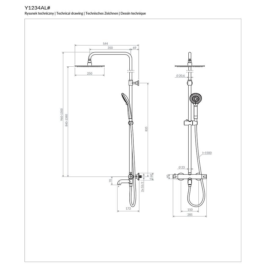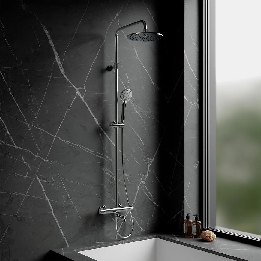 System wannowo-natryskowy Y w kolorze chrom z deszczownicą i baterią termostatyczną to nowoczesne i praktyczne rozwiązanie do łazienki z wanną. Zapewnia komfort kąpieli i prysznica, precyzyjną regulację temperatury oraz elegancki wygląd dzięki lśniącemu, chromowanemu wykończeniu.