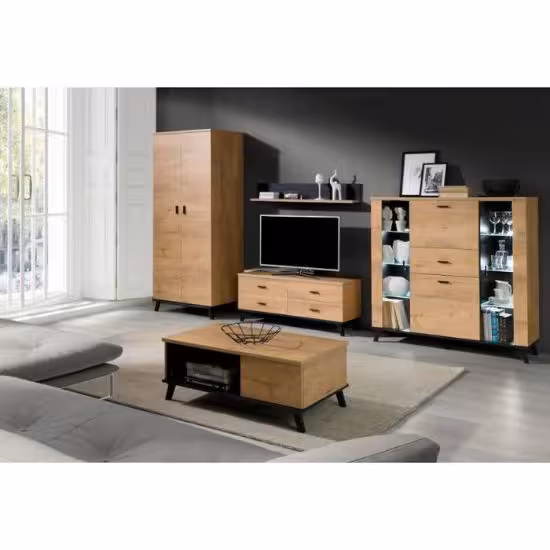 Szafa w kolorze dąb lefkas/czarny z kolekcji John to doskonała propozycja do pokoju dziennego, ale znajdzie swoje miejsce również w innym pomieszczeniu, jak na przykład - przedpokój czy garderobie, sypialni. Materiał wykonania to płyta laminowana. Mebel będzie świetnym miejscem do wieszania ubrań, na buty lub inne domowe tekstylia. Nowoczesny styl mebli wpadnie do gustu każdemu, kto poszukuje eleganckiego, klasycznego, a zarazem nowoczesnego umeblowania. Idealnie wpasuje się w większość aranżacji. Szafa przeznaczona do samodzielnego montażu.