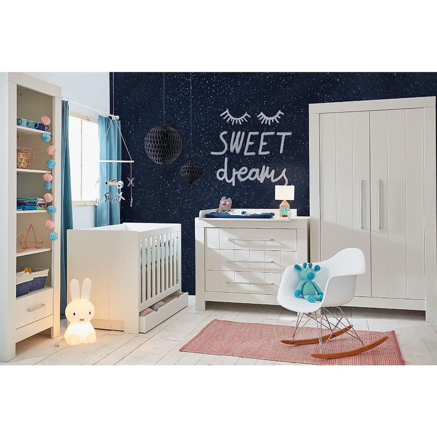 Szafa dwudrzwiowa, wykonana z malowanej płyty MDF z elementami wewnętrznymi z płyty laminowanej, gwarantuje trwałość i łatwość w utrzymaniu. System cichego zamykania zapewniają też bezpieczne użytkowanie, co jest szczególnie ważne w pokoju dziecięcym.