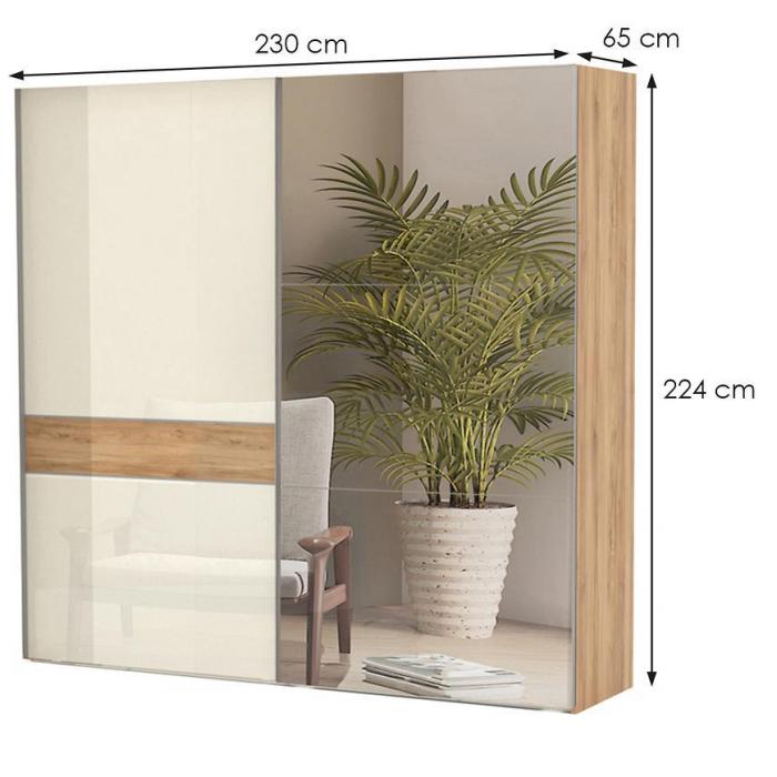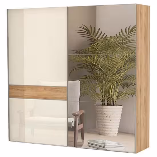 Szafa w kolorze beige/pacific walnut to propozycja do pokoju dziennego, ale znajdzie swoje miejsce również w innym pomieszczeniu, jak na przykład - przedpokój czy garderobie. Materiał wykonania to płyta laminowana. Szafa posiada półki oraz drążek na ubrania. Mebel posiada lustro, które sprawi, że pomieszczenie stanie się optycznie większe. Nowoczesny styl mebli wpadnie do gustu każdemu, kto poszukuje eleganckiego, klasycznego, a zarazem nowoczesnego umeblowania. Idealnie wpasuje się w większość aranżacji. Przeznaczona do samodzielnego montażu. Mebel do samodzielnego montażu.