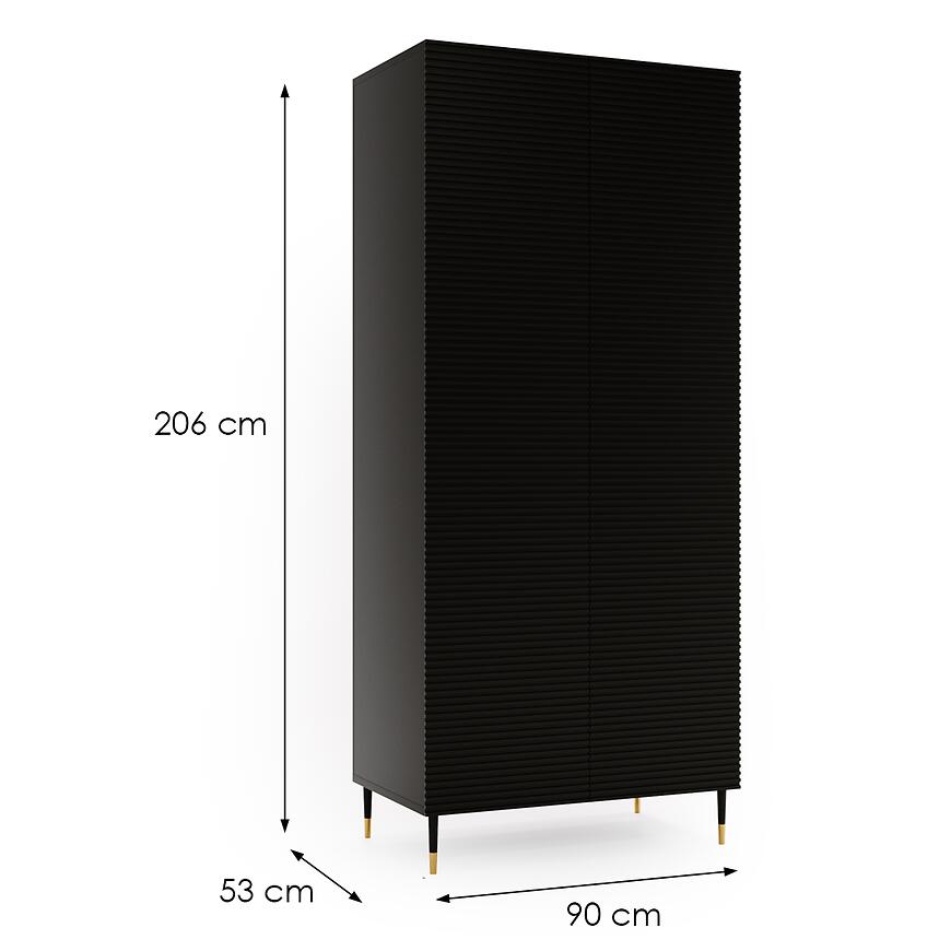 Dwudrzwiowa szafa Imperial o wymiarach 90 cm szerokości, 206 cm wysokości i 53 cm głębokości to kompaktowy, a zarazem pojemny mebel, który doskonale odnajdzie się nawet w mniejszych przestrzeniach. Jej prosta forma oraz czarny, matowy kolor frontów i korpusu wpisują się w aktualne trendy aranżacyjne. Brak lustra podkreśla minimalistyczny styl, pozwalając zachować spójną estetykę pomieszczenia.