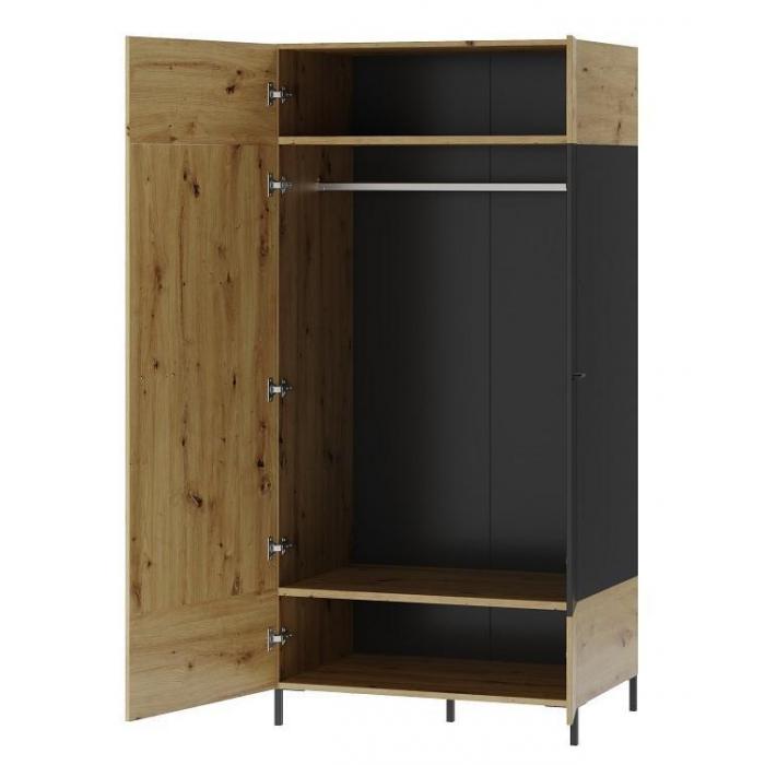 Pojemna, dwudrzwiowa szafa Lumi dostępna w kolorze dąb artisan z czarnymi wstawkami. W środku u szczytu mebla znajduje się półka konstrukcyjna, pod którą zainstalowany jest drążek na wieszaki ubraniowe. Na dole umieszczona została dodatkowa półka. Szafa posiada metalowe nóżki w kolorze czarnym, uchwyty wykonane z tworzywa. Dodatkowym atutem jest system cichego domyku.