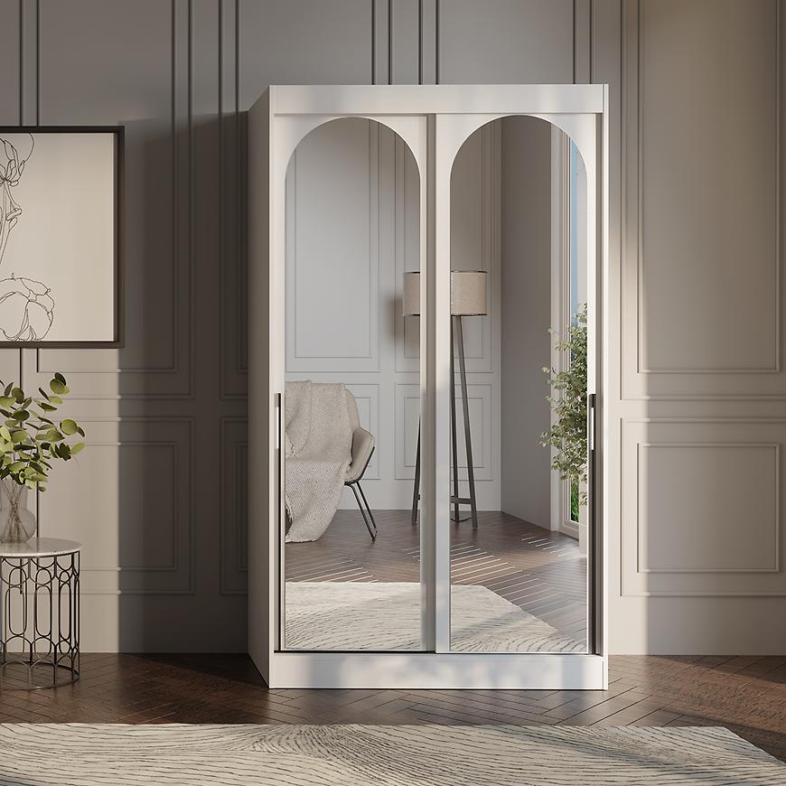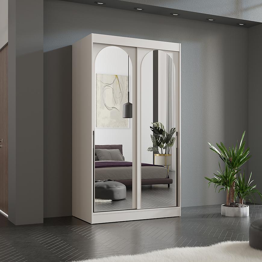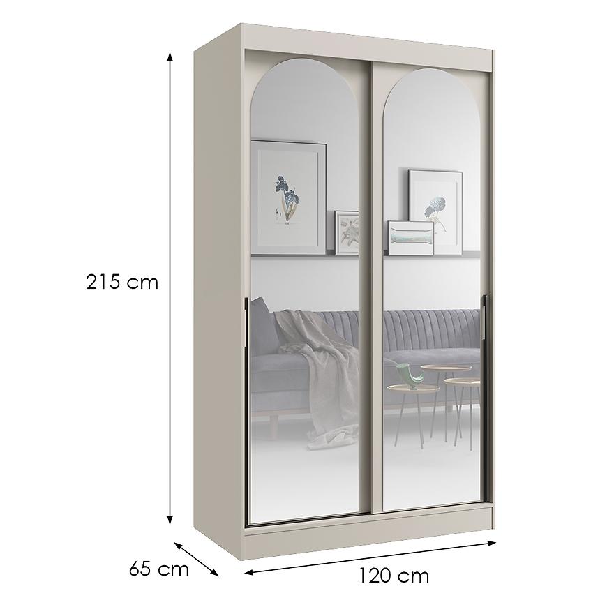 Ta dwudrzwiowa szafa z drzwiami przesuwnymi została zaprojektowana z myślą o maksymalnej wygodzie użytkowania – drzwi przesuwne nie zajmują dodatkowej przestrzeni przy otwieraniu, dzięki czemu szafa sprawdzi się nawet w mniejszych pomieszczeniach. Lustro umieszczone na frontach optycznie powiększa wnętrze i pełni praktyczną funkcję w codziennym użytkowaniu.