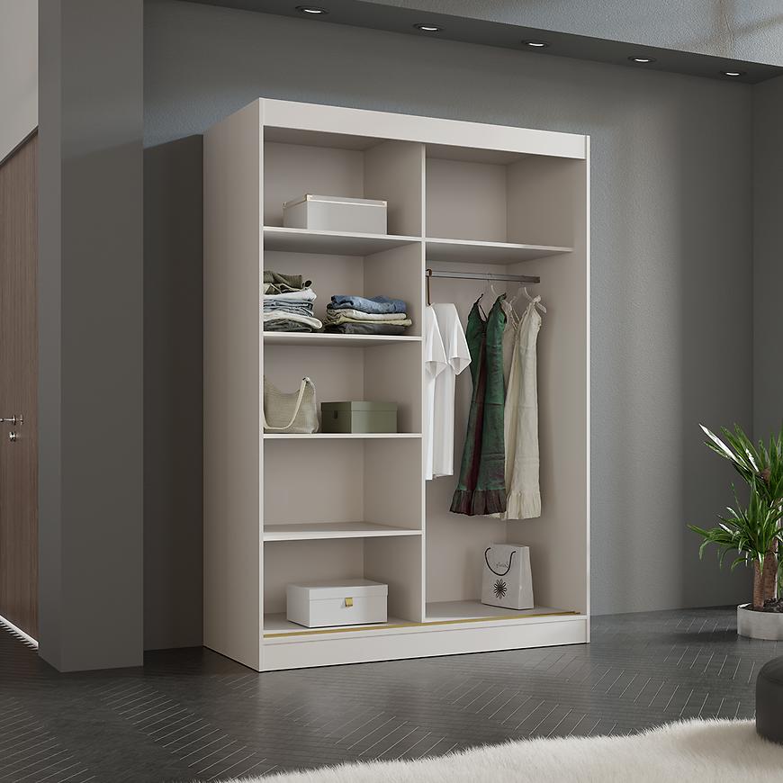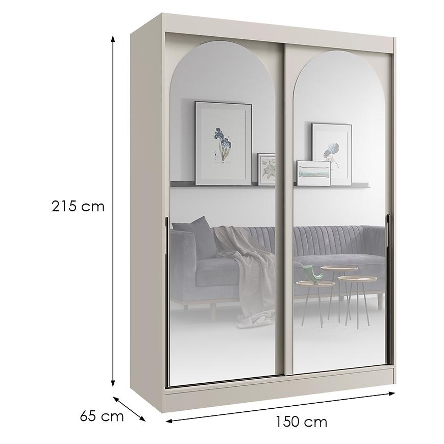 Ta dwudrzwiowa szafa z drzwiami przesuwnymi została zaprojektowana z myślą o maksymalnej wygodzie użytkowania – drzwi przesuwne nie zajmują dodatkowej przestrzeni przy otwieraniu, dzięki czemu szafa sprawdzi się nawet w mniejszych pomieszczeniach. Lustro umieszczone na frontach optycznie powiększa wnętrze i pełni praktyczną funkcję w codziennym użytkowaniu.