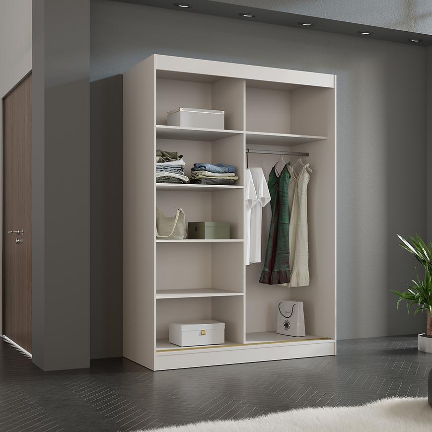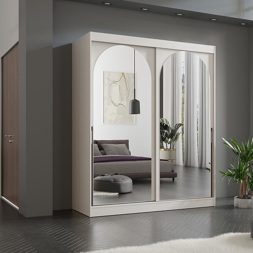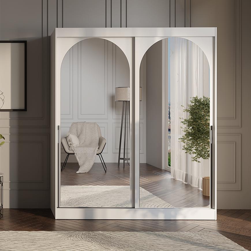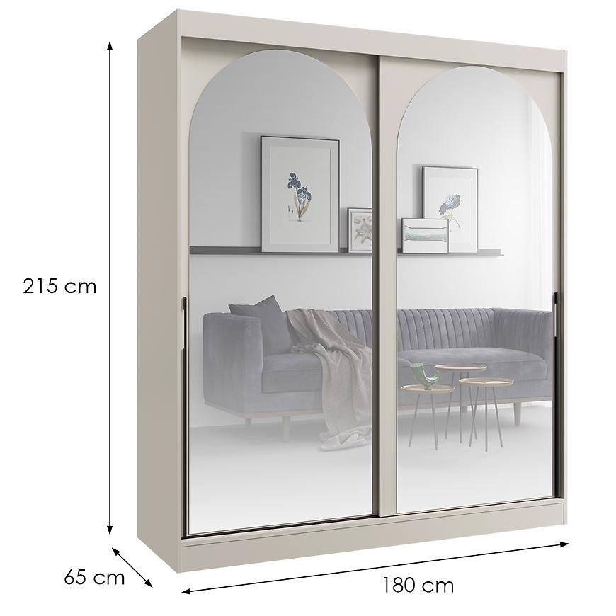 Ta dwudrzwiowa szafa z drzwiami przesuwnymi została zaprojektowana z myślą o maksymalnej wygodzie użytkowania – drzwi przesuwne nie zajmują dodatkowej przestrzeni przy otwieraniu, dzięki czemu szafa sprawdzi się nawet w mniejszych pomieszczeniach. Lustro umieszczone na frontach optycznie powiększa wnętrze i pełni praktyczną funkcję w codziennym użytkowaniu.