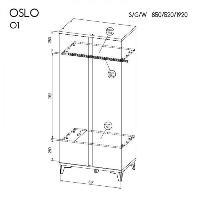 Szafa dwudrzwiowa z kolekcji Oslo. Korpus wykonany w kolorze dąb riva, fronty w kolorze biały połysk. W środku, w górnej oraz dolnej części znajdują sie półki o maksymalnym obciążeniu do 7 kg. Szafa Oslo posiada również drążek na ubrania umiejscowiony pod górną półką.