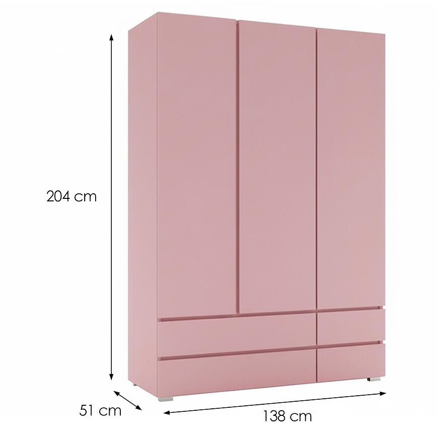 Szafa 3D Cosmo C17 w kolorze różowym to propozycja dla osób, które chcą dodać wnętrzu wyrazistego akcentu i jednocześnie zyskać praktyczne miejsce do przechowywania. Dzięki wymiarom 138 cm szerokości i 204 cm wysokości zapewnia dużą przestrzeń użytkową, sprawdzając się w sypialni, garderobie oraz pokoju młodzieżowym.