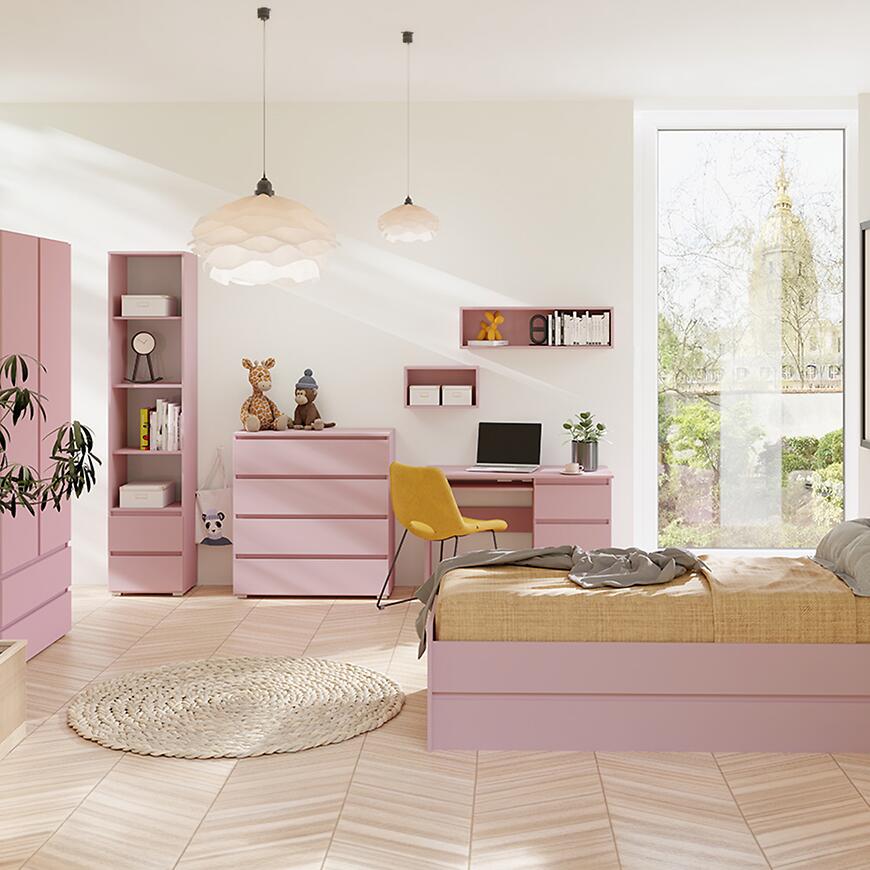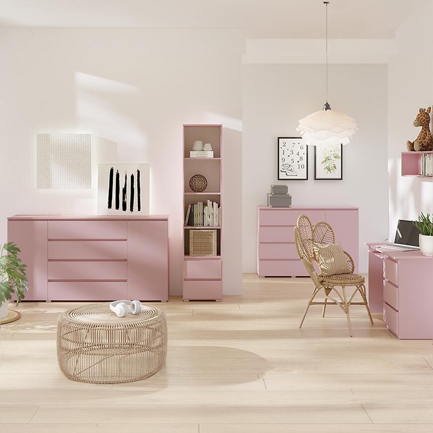Matowe wykończenie frontów i korpusu nadaje meblowi subtelny, elegancki wygląd, a jednolita różowa kolorystyka wyróżnia go w aranżacji wnętrza. Konstrukcja z laminowanej płyty wiórowej zapewnia solidność i odporność na codzienne użytkowanie, dzięki czemu szafa zachowuje estetyczny wygląd przez długi czas.