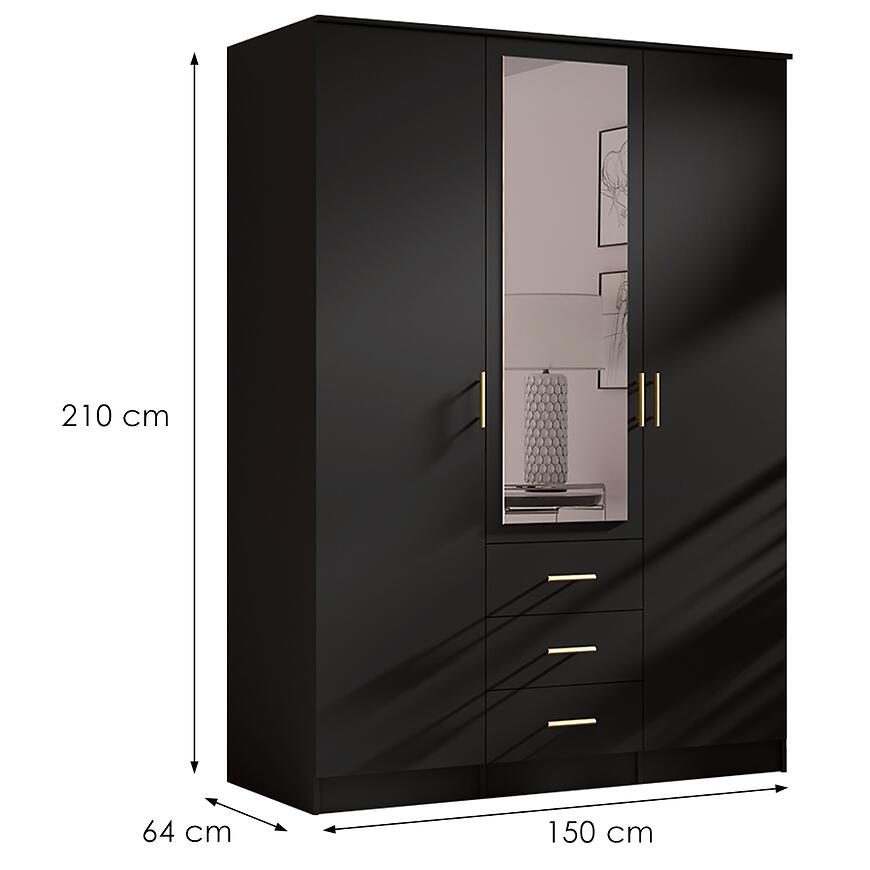 Dzięki przemyślanym wymiarom szafa 3D czarna 150 cm sprawdzi się zarówno w większych, jak i średnich pomieszczeniach. To praktyczna szafa do sypialni, która łączy estetykę z funkcjonalnością, oferując dużo miejsca do przechowywania w atrakcyjnej, nowoczesnej formie. Jeśli szukasz czarnej szafy trzydrzwiowej z lustrem, półkami, szufladami i drążkiem na ubrania, model z kolekcji 3D będzie doskonałym wyborem, który podkreśli charakter wnętrza i zapewni komfort codziennego użytkowania.