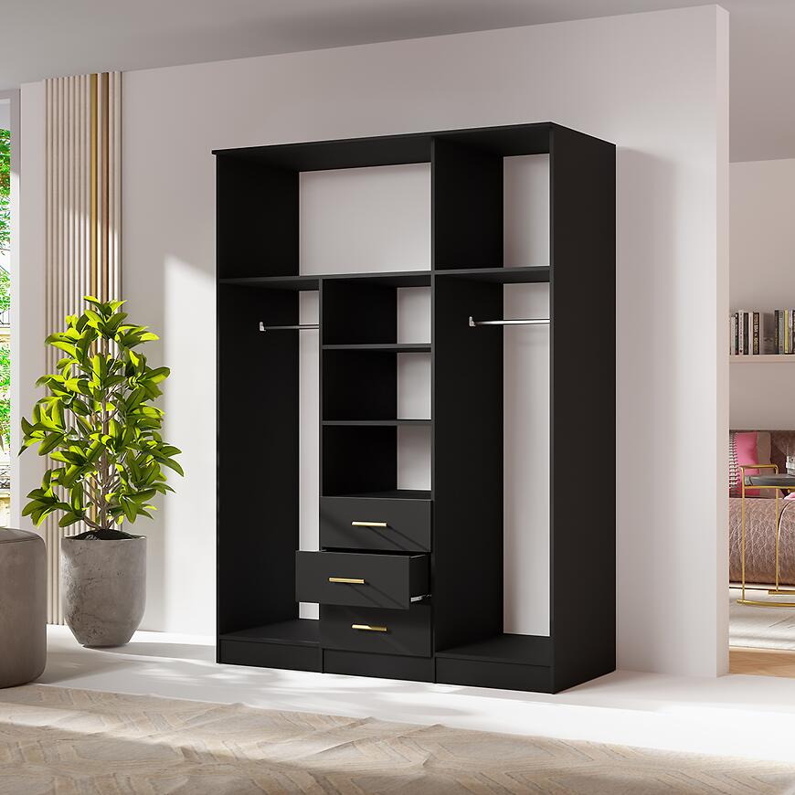 Wnętrze szafy 3D zostało zaprojektowane z myślą o wygodnym przechowywaniu odzieży i dodatków. Mebel wyposażono w funkcjonalne półki, solidny drążek na ubrania oraz trzy praktyczne szuflady, które idealnie sprawdzą się na bieliznę, akcesoria lub mniejsze elementy garderoby. Takie rozplanowanie przestrzeni umożliwia łatwą organizację ubrań codziennych, sezonowych oraz eleganckich stylizacji. Szafa z półkami i szufladami to rozwiązanie, które pomaga utrzymać porządek i maksymalnie wykorzystać dostępne miejsce.