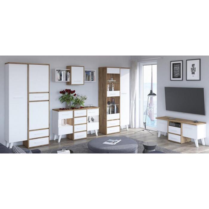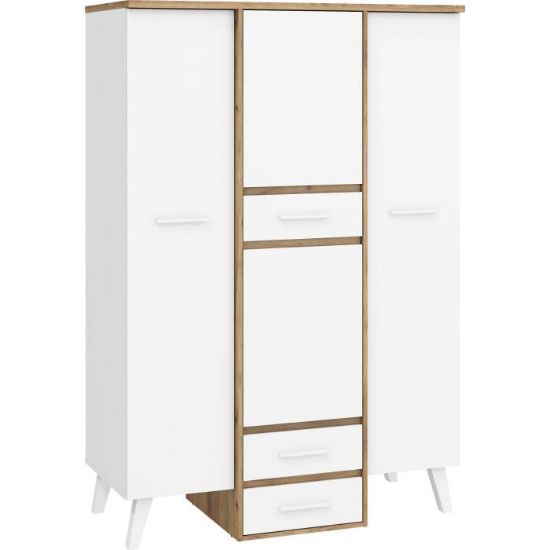 Szafa w kolorze craft złoty/biały z kolekcji Nordis to doskonała propozycja do pokoju dziennego, ale znajdzie swoje miejsce również w innym pomieszczeniu, jak na przykład - przedpokój czy garderobie, sypialni. Materiał wykonania to płyta laminowana. Szafa posiada półki, drążek na ubrania i szuflady. Mebel będzie świetnym miejscem do wieszania ubrań, na buty lub inne domowe tekstylia. Nowoczesny styl mebli wpadnie do gustu każdemu, kto poszukuje eleganckiego, klasycznego, a zarazem nowoczesnego umeblowania. Idealnie wpasuje się w większość aranżacji. Szafa przeznaczona do samodzielnego montażu.