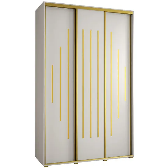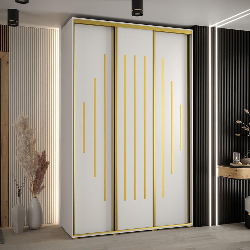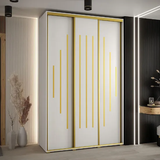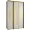 Szafa Canaris 12 w kolorze biały/gold. Szafa trzydrzwiowa z drzwiami przesuwnymi wykonana z płyty wiórowej laminowanej. Szafa charakteryzuje się nowoczesnym stylem i funkcjonalnością. Fronty oraz korpus szafy w matowym wykończeniu tworzą modny minimalistyczny wygląd. Mebel przeznaczony jest do samodzielnego montażu.