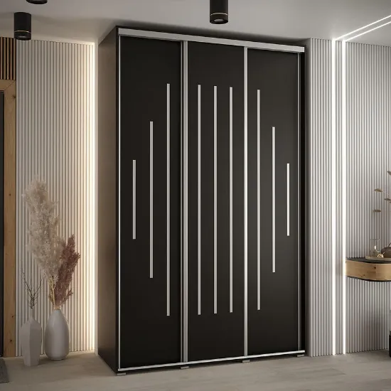 Szafa Canaris 12 w kolorze czarny/silver. Szafa trzydrzwiowa z drzwiami przesuwnymi wykonana z płyty wiórowej laminowanej. Szafa charakteryzuje się nowoczesnym stylem i funkcjonalnością. Fronty oraz korpus szafy w matowym wykończeniu tworzą modny minimalistyczny wygląd. Mebel przeznaczony jest do samodzielnego montażu.