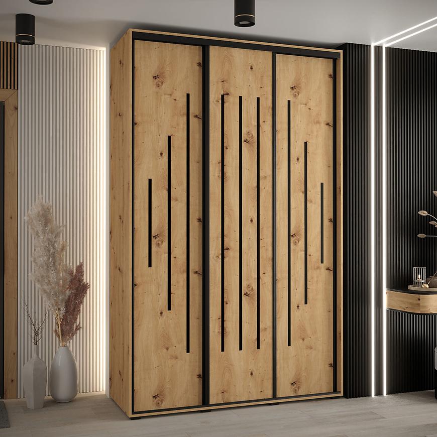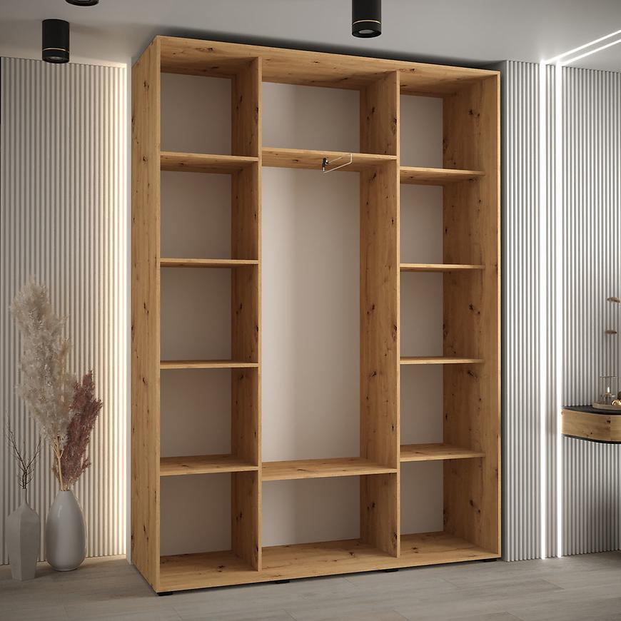 Szafa Canaris 12 w kolorze artisan/czarny o szerokości 170 cm. Szafa trzydrzwiowa z drzwiami przesuwnymi wykonana z płyty wiórowej laminowanej. W środku szafa posiada jeden drążek poprzeczny na ubrania oraz półki z mnóstwem miejsca do przechowywania. Szafa charakteryzuje się nowoczesnym stylem i funkcjonalnością. Fronty oraz korpus szafy w matowym wykończeniu tworzą modny minimalistyczny wygląd. Mebel przeznaczony jest do samodzielnego montażu.
