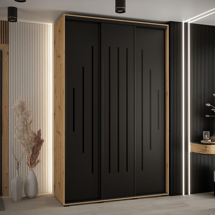 Szafa Canaris 12 w kolorze artisan/czarny/czarny o szerokości 170 cm. Szafa trzydrzwiowa z drzwiami przesuwnymi wykonana z płyty wiórowej laminowanej. W środku szafa posiada jeden drążek poprzeczny na ubrania oraz półki z mnóstwem miejsca do przechowywania. Szafa charakteryzuje się nowoczesnym stylem i funkcjonalnością. Fronty oraz korpus szafy w matowym wykończeniu tworzą modny minimalistyczny wygląd. Mebel przeznaczony jest do samodzielnego montażu.