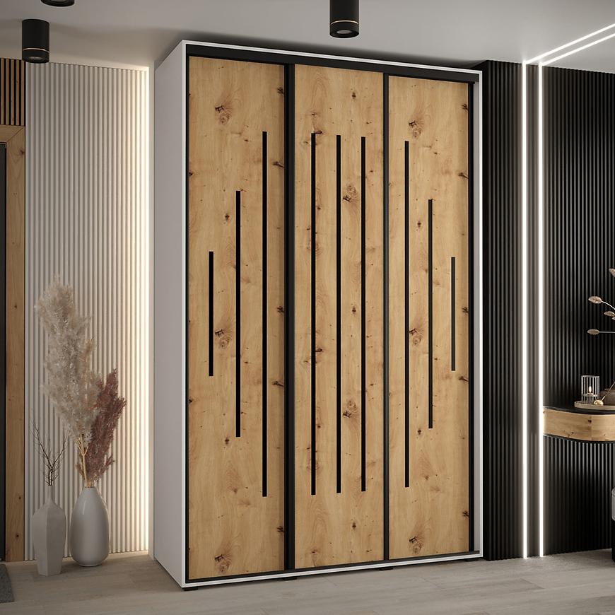 Szafa Canaris 12 w kolorze biały/artisan/czarny o szerokości 170 cm. Szafa trzydrzwiowa z drzwiami przesuwnymi wykonana z płyty wiórowej laminowanej. W środku szafa posiada jeden drążek poprzeczny na ubrania oraz półki z mnóstwem miejsca do przechowywania. Szafa charakteryzuje się nowoczesnym stylem i funkcjonalnością. Fronty oraz korpus szafy w matowym wykończeniu tworzą modny minimalistyczny wygląd. Mebel przeznaczony jest do samodzielnego montażu.