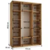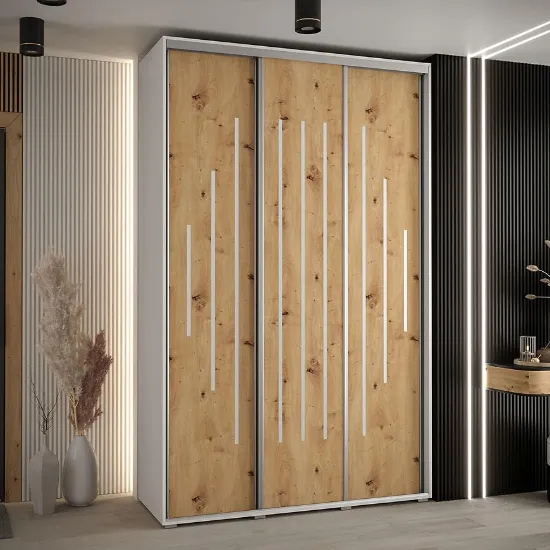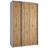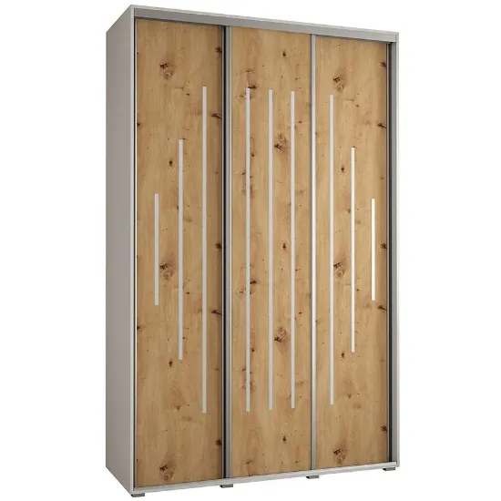 Szafa Canaris 12 w kolorze biały/artisan/silver o szerokości 170 cm. Szafa trzydrzwiowa z drzwiami przesuwnymi wykonana z płyty wiórowej laminowanej. W środku szafa posiada jeden drążek poprzeczny na ubrania oraz półki z mnóstwem miejsca do przechowywania. Szafa charakteryzuje się nowoczesnym stylem i funkcjonalnością. Fronty oraz korpus szafy w matowym wykończeniu tworzą modny minimalistyczny wygląd. Mebel przeznaczony jest do samodzielnego montażu.
