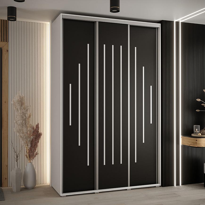 Szafa Canaris 12 w kolorze biały/czarny/silver o szerokości 170 cm. Szafa trzydrzwiowa z drzwiami przesuwnymi wykonana z płyty wiórowej laminowanej. W środku szafa posiada jeden drążek poprzeczny na ubrania oraz półki z mnóstwem miejsca do przechowywania. Szafa charakteryzuje się nowoczesnym stylem i funkcjonalnością. Fronty oraz korpus szafy w matowym wykończeniu tworzą modny minimalistyczny wygląd. Mebel przeznaczony jest do samodzielnego montażu.