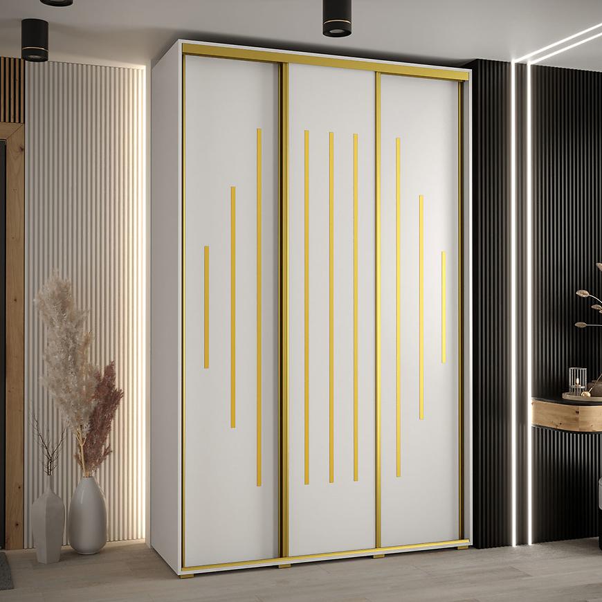 Szafa Canaris 12 w kolorze biały/gold o szerokości 170 cm. Szafa trzydrzwiowa z drzwiami przesuwnymi wykonana z płyty wiórowej laminowanej. W środku szafa posiada jeden drążek poprzeczny na ubrania oraz półki z mnóstwem miejsca do przechowywania. Szafa charakteryzuje się nowoczesnym stylem i funkcjonalnością. Fronty oraz korpus szafy w matowym wykończeniu tworzą modny minimalistyczny wygląd. Mebel przeznaczony jest do samodzielnego montażu.