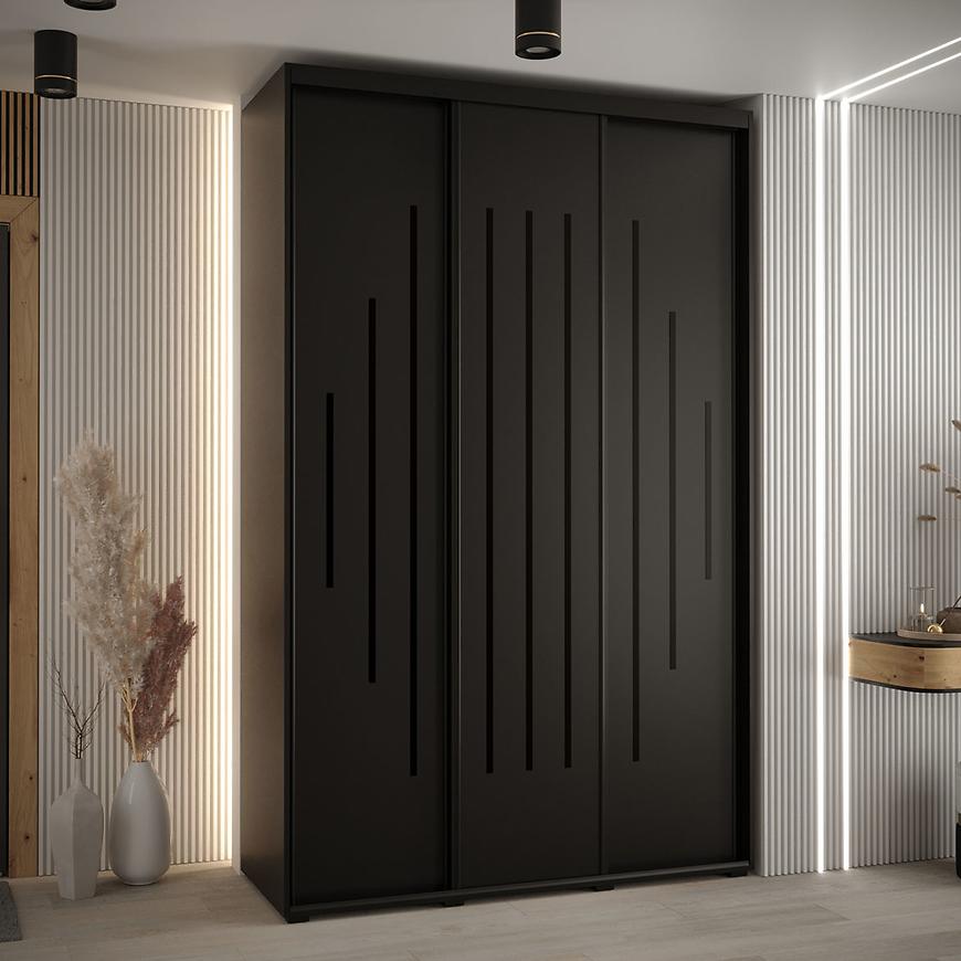 Szafa Canaris 12 w kolorze czarny/czarny o szerokości 170 cm. Szafa trzydrzwiowa z drzwiami przesuwnymi wykonana z płyty wiórowej laminowanej. W środku szafa posiada jeden drążek poprzeczny na ubrania oraz półki z mnóstwem miejsca do przechowywania. Szafa charakteryzuje się nowoczesnym stylem i funkcjonalnością. Fronty oraz korpus szafy w matowym wykończeniu tworzą modny minimalistyczny wygląd. Mebel przeznaczony jest do samodzielnego montażu.