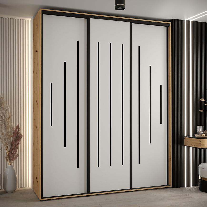 Szafa Canaris 12 w kolorze artisan/biały/czarny o szerokości 190 cm. Szafa trzydrzwiowa z drzwiami przesuwnymi wykonana z płyty wiórowej laminowanej. W środku szafa posiada dwa drążki poprzeczne na ubrania wiszące oraz półki z mnóstwem miejsca do przechowywania. Szafa charakteryzuje się nowoczesnym stylem i funkcjonalnością. Fronty oraz korpus szafy w matowym wykończeniu tworzą modny minimalistyczny wygląd. Mebel przeznaczony jest do samodzielnego montażu.