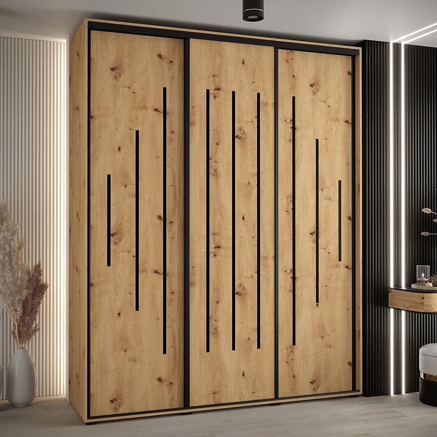 Szafa Canaris 12 w kolorze artisan/czarny o szerokości 190 cm. Szafa trzydrzwiowa z drzwiami przesuwnymi wykonana z płyty wiórowej laminowanej. W środku szafa posiada dwa drążki poprzeczne na ubrania wiszące oraz półki z mnóstwem miejsca do przechowywania. Szafa charakteryzuje się nowoczesnym stylem i funkcjonalnością. Fronty oraz korpus szafy w matowym wykończeniu tworzą modny minimalistyczny wygląd. Mebel przeznaczony jest do samodzielnego montażu.
