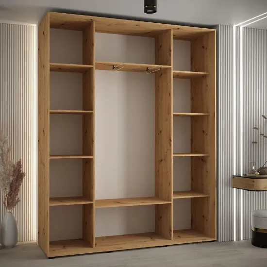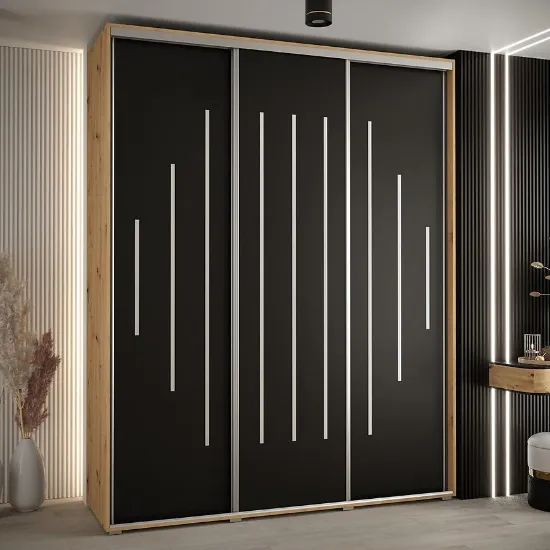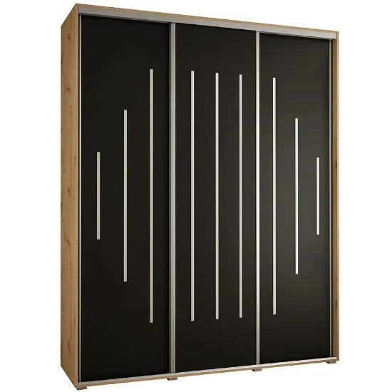 Szafa Canaris 12 w kolorze artisan/czarny/silver o szerokości 190 cm. Szafa trzydrzwiowa z drzwiami przesuwnymi wykonana z płyty wiórowej laminowanej. W środku szafa posiada dwa drążki poprzeczne na ubrania wiszące oraz półki z mnóstwem miejsca do przechowywania. Szafa charakteryzuje się nowoczesnym stylem i funkcjonalnością. Fronty oraz korpus szafy w matowym wykończeniu tworzą modny minimalistyczny wygląd. Mebel przeznaczony jest do samodzielnego montażu.