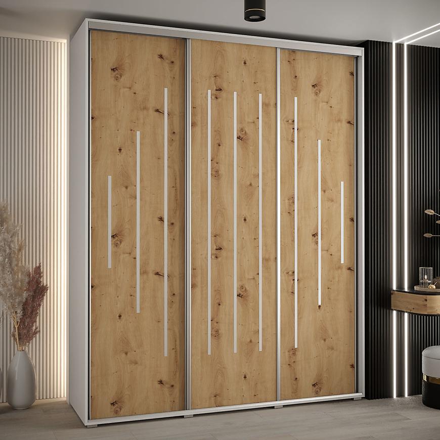 Szafa Canaris 12 w kolorze biały/artisan/silver o szerokości 190 cm. Szafa trzydrzwiowa z drzwiami przesuwnymi wykonana z płyty wiórowej laminowanej. W środku szafa posiada dwa drążki poprzeczne na ubrania wiszące oraz półki z mnóstwem miejsca do przechowywania. Szafa charakteryzuje się nowoczesnym stylem i funkcjonalnością. Fronty oraz korpus szafy w matowym wykończeniu tworzą modny minimalistyczny wygląd. Mebel przeznaczony jest do samodzielnego montażu.