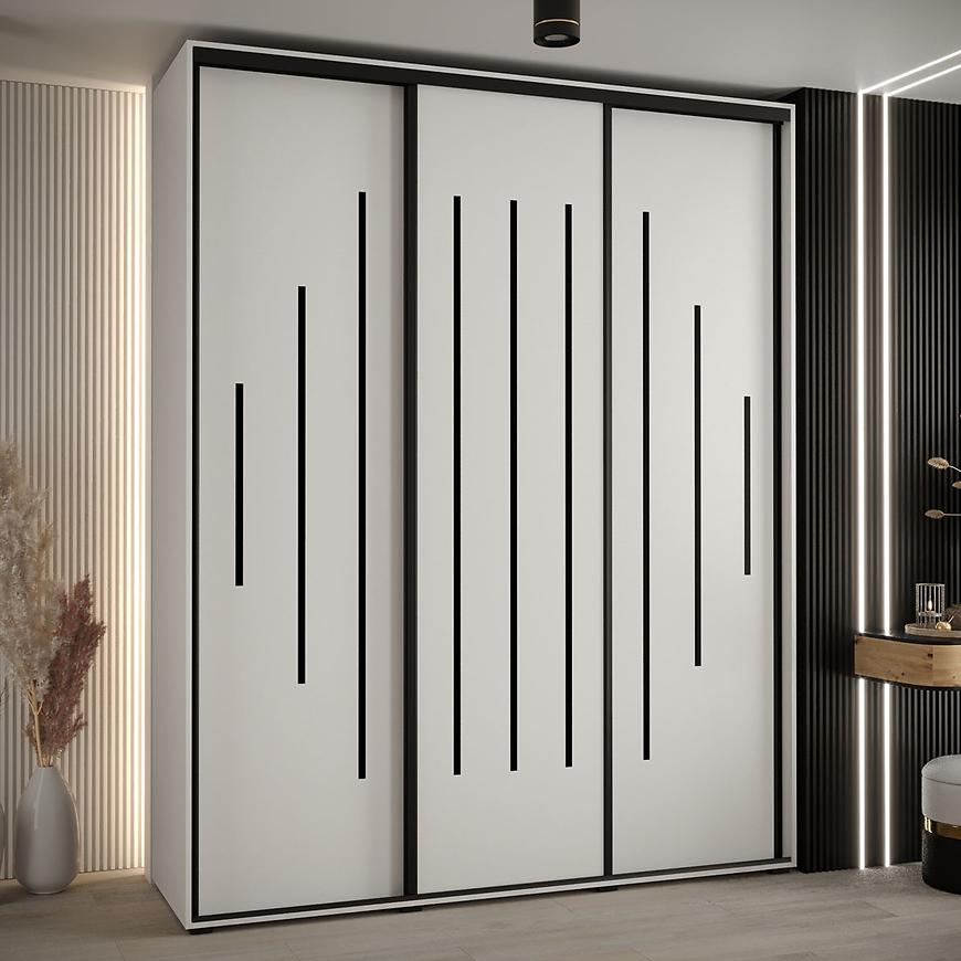 Szafa Canaris 12 w kolorze biały/czarny o szerokości 190 cm. Szafa trzydrzwiowa z drzwiami przesuwnymi wykonana z płyty wiórowej laminowanej. W środku szafa posiada dwa drążki poprzeczne na ubrania wiszące oraz półki z mnóstwem miejsca do przechowywania. Szafa charakteryzuje się nowoczesnym stylem i funkcjonalnością. Fronty oraz korpus szafy w matowym wykończeniu tworzą modny minimalistyczny wygląd. Mebel przeznaczony jest do samodzielnego montażu.
