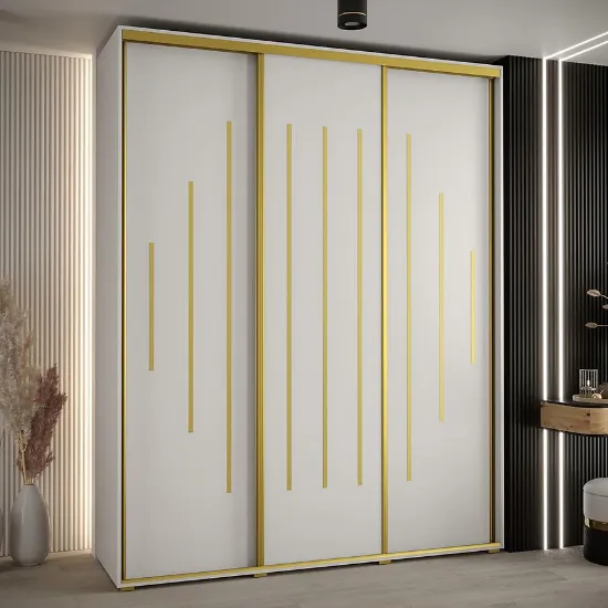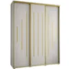 Szafa Canaris 12 w kolorze biały/gold o szerokości 190 cm. Szafa trzydrzwiowa z drzwiami przesuwnymi wykonana z płyty wiórowej laminowanej. W środku szafa posiada dwa drążki poprzeczne na ubrania wiszące oraz półki z mnóstwem miejsca do przechowywania. Szafa charakteryzuje się nowoczesnym stylem i funkcjonalnością. Fronty oraz korpus szafy w matowym wykończeniu tworzą modny minimalistyczny wygląd. Mebel przeznaczony jest do samodzielnego montażu.