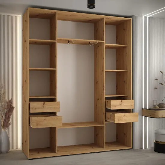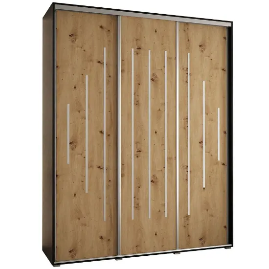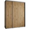 Szafa Canaris 12 w kolorze czarny/artisan/silver o szerokości 190 cm. Szafa trzydrzwiowa z drzwiami przesuwnymi wykonana z płyty wiórowej laminowanej. W środku szafa posiada dwa drążki poprzeczne na ubrania wiszące oraz półki z mnóstwem miejsca do przechowywania. Szafa charakteryzuje się nowoczesnym stylem i funkcjonalnością. Fronty oraz korpus szafy w matowym wykończeniu tworzą modny minimalistyczny wygląd. Mebel przeznaczony jest do samodzielnego montażu.
