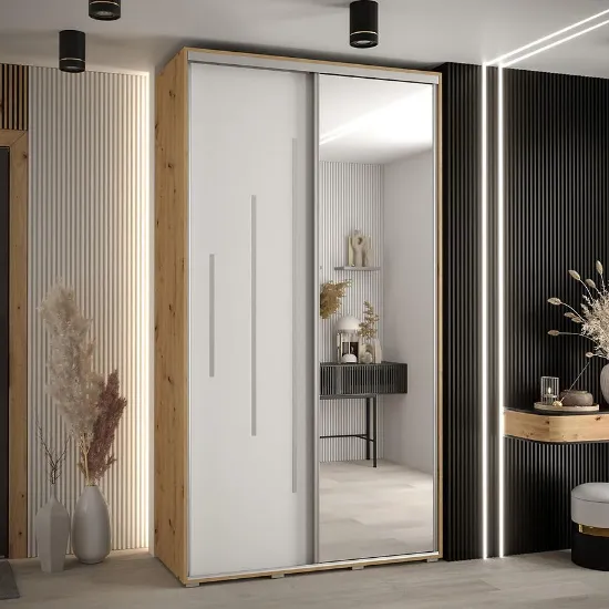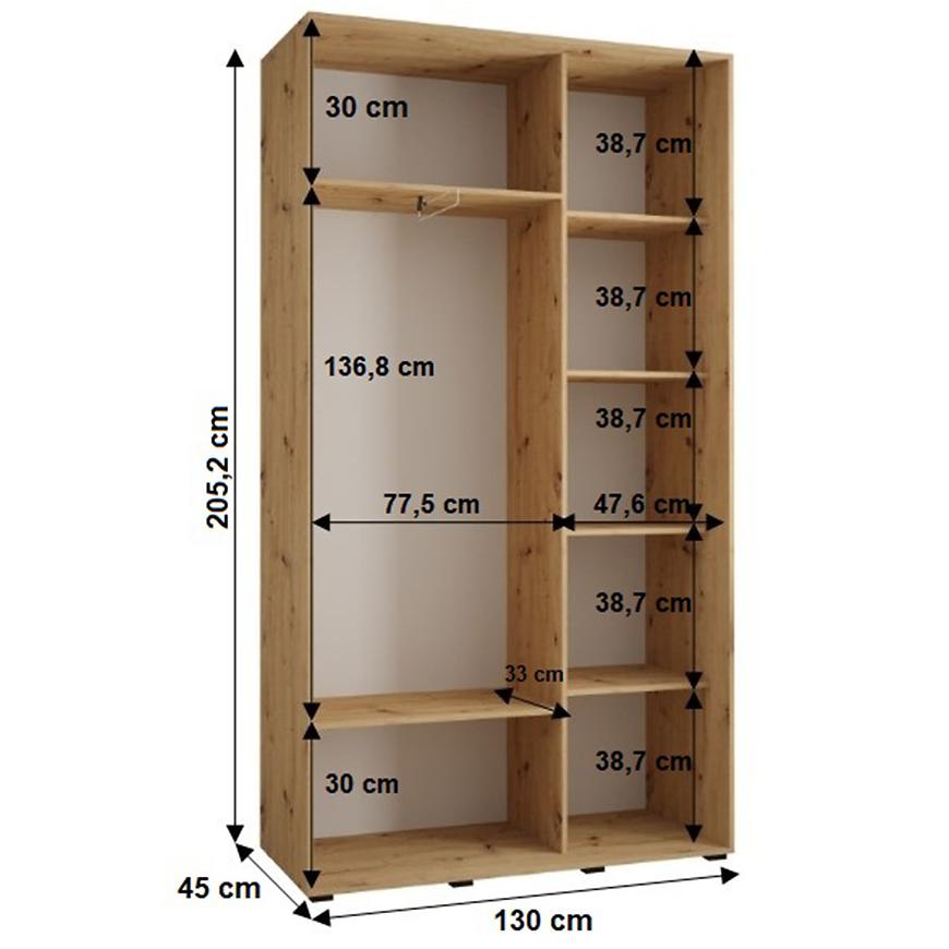 Szafa z lustrem Canaris 13 w kolorze artisan/biały/silver o szerokości 130 cm. Szafa dwudrzwiowa z drzwiami przesuwnymi wykonana z płyty wiórowej laminowanej. Froncie jednych z drzwi umieszczono lustro które optycznie powiększa pomieszczenie. W środku szafa posiada drążek poprzeczny na ubrania wiszące oraz półki z mnóstwem miejsca do przechowywania. Szafa charakteryzuje się nowoczesnym stylem i funkcjonalnością. Fronty oraz korpus szafy w matowym wykończeniu tworzą modny minimalistyczny wygląd. Mebel przeznaczony jest do samodzielnego montażu.