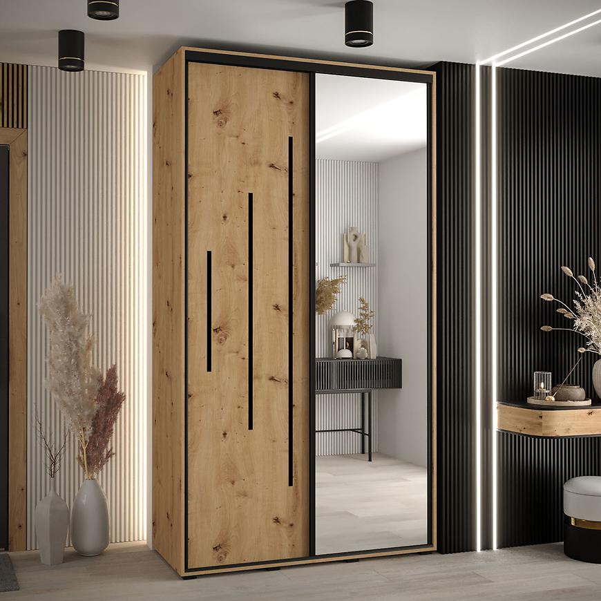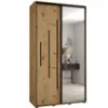 Szafa z lustrem Canaris 13 w kolorze artisan/czarny o szerokości 130 cm. Szafa dwudrzwiowa z drzwiami przesuwnymi wykonana z płyty wiórowej laminowanej. Froncie jednych z drzwi umieszczono lustro które optycznie powiększa pomieszczenie. W środku szafa posiada drążek poprzeczny na ubrania wiszące oraz półki z mnóstwem miejsca do przechowywania. Szafa charakteryzuje się nowoczesnym stylem i funkcjonalnością. Fronty oraz korpus szafy w matowym wykończeniu tworzą modny minimalistyczny wygląd. Mebel przeznaczony jest do samodzielnego montażu.
