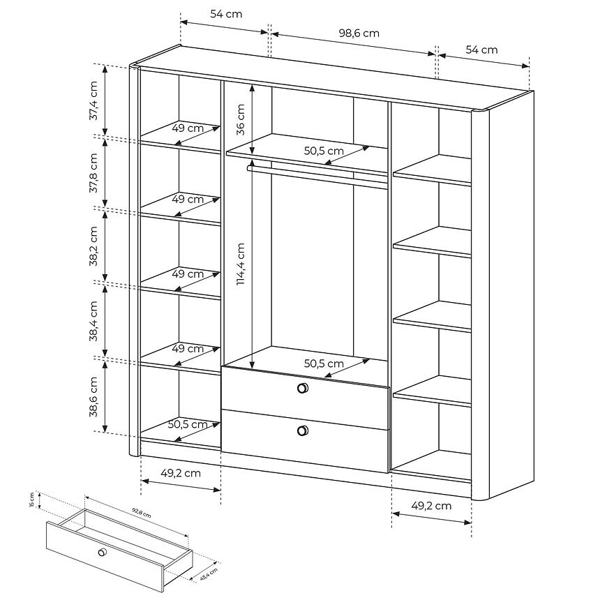 Konstrukcja z laminowanej płyty wiórowej zapewnia solidność i trwałość, a szuflady i drzwi działają płynnie i bezproblemowo. Szafa jest pojemna i stabilna, waży 145 kg, co gwarantuje wytrzymałość na lata codziennego użytkowania.