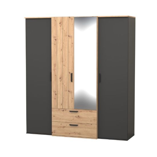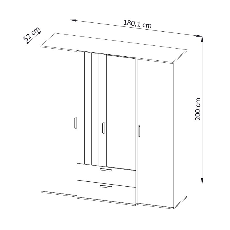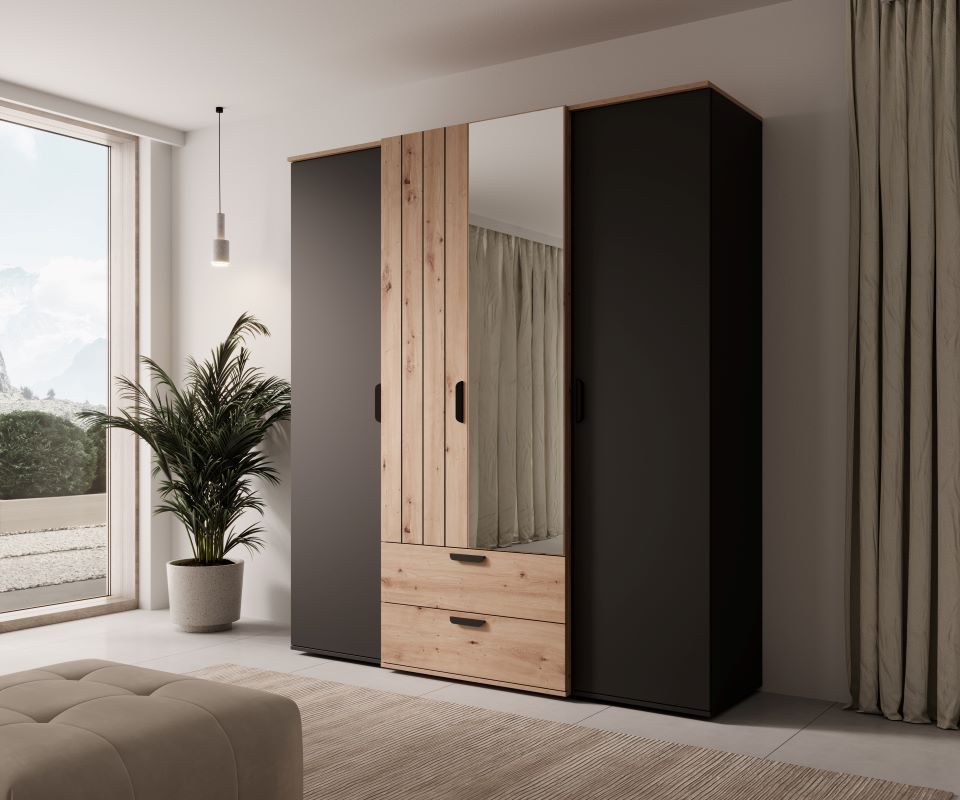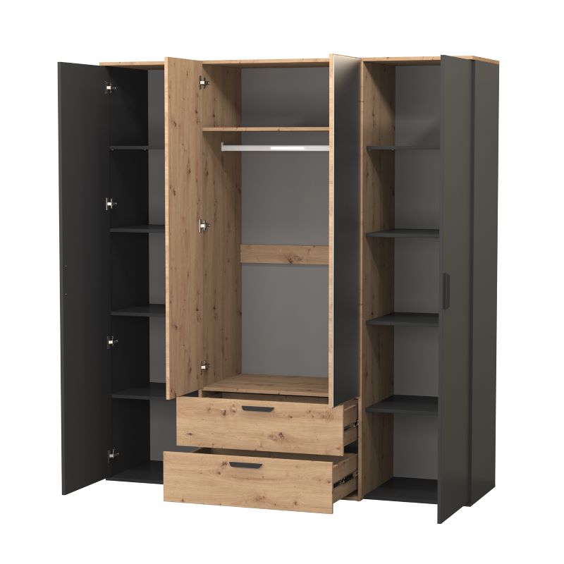 Praktyczność to kolejna cecha, która wyróżnia szafę Alanis spośród innych mebli. Ten model posiada cztery uchylne drzwi, które umożliwiają łatwy dostęp do wnętrza szafy. Dodatkowo, wewnątrz znajdują się półki, na których można przechowywać ubrania, akcesoria lub inne przedmioty oraz drążek na ubrania. Dwa dodatkowe schowki w postaci szuflad to doskonałe rozwiązanie dla tych, którzy potrzebują dodatkowej przestrzeni do przechowywania drobiazgów.