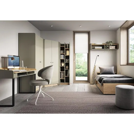 Zestaw System Alessio eukaliptus łączy estetykę z praktycznym zastosowaniem. Odcień eukaliptusa wprowadza do wnętrza świeżość i naturalny charakter, sprawiając, że pokój młodzieżowy staje się przyjazny i harmonijny. Meble Alessio łatwo dopasować do różnych stylów wnętrz, a ich nowoczesny design wspiera codzienną aktywność młodzieży – naukę, zabawę i relaks.