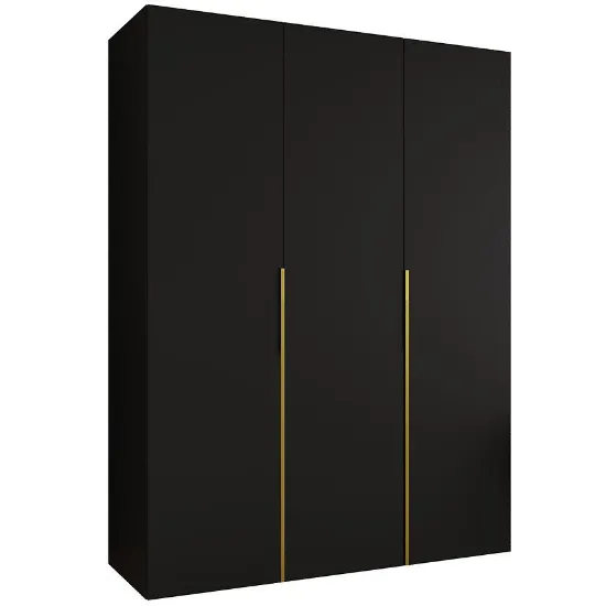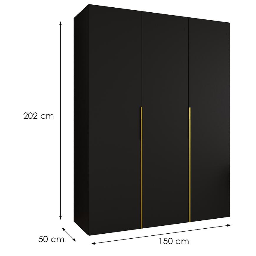 Szafa Alicante I 150 czarny/złoty to propozycja dla osób poszukujących pojemnej i estetycznej szafy do sypialni, garderoby lub przedpokoju, która łączy nowoczesny styl z praktycznym układem. Model o szerokości 150 cm, wysokości 202 cm oraz głębokości 50 cm zapewnia optymalne wykorzystanie przestrzeni, nawet w pomieszczeniach o ograniczonym metrażu. Prosta bryła oraz klasyczne drzwi sprawiają, że szafa Alicante I 150 doskonale wpisuje się w aktualne trendy aranżacyjne, a jednocześnie pozostaje uniwersalnym wyborem do wielu typów wnętrz. To nowoczesna szafa bez lustra, zaprojektowana z myślą o osobach ceniących spójną estetykę i porządek.