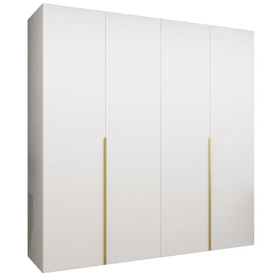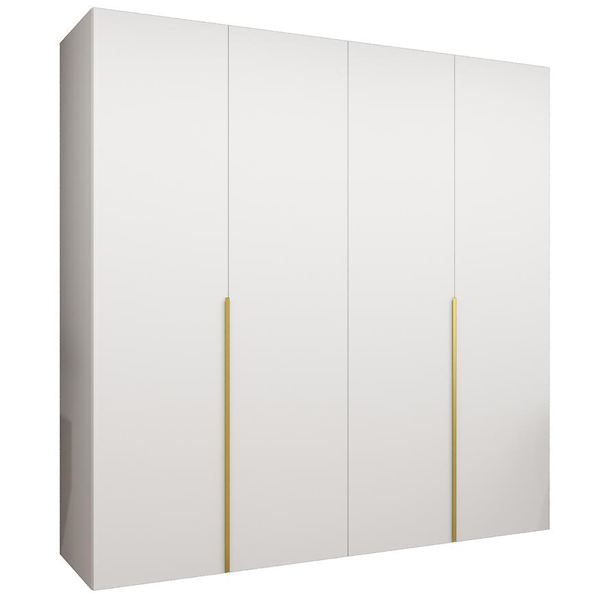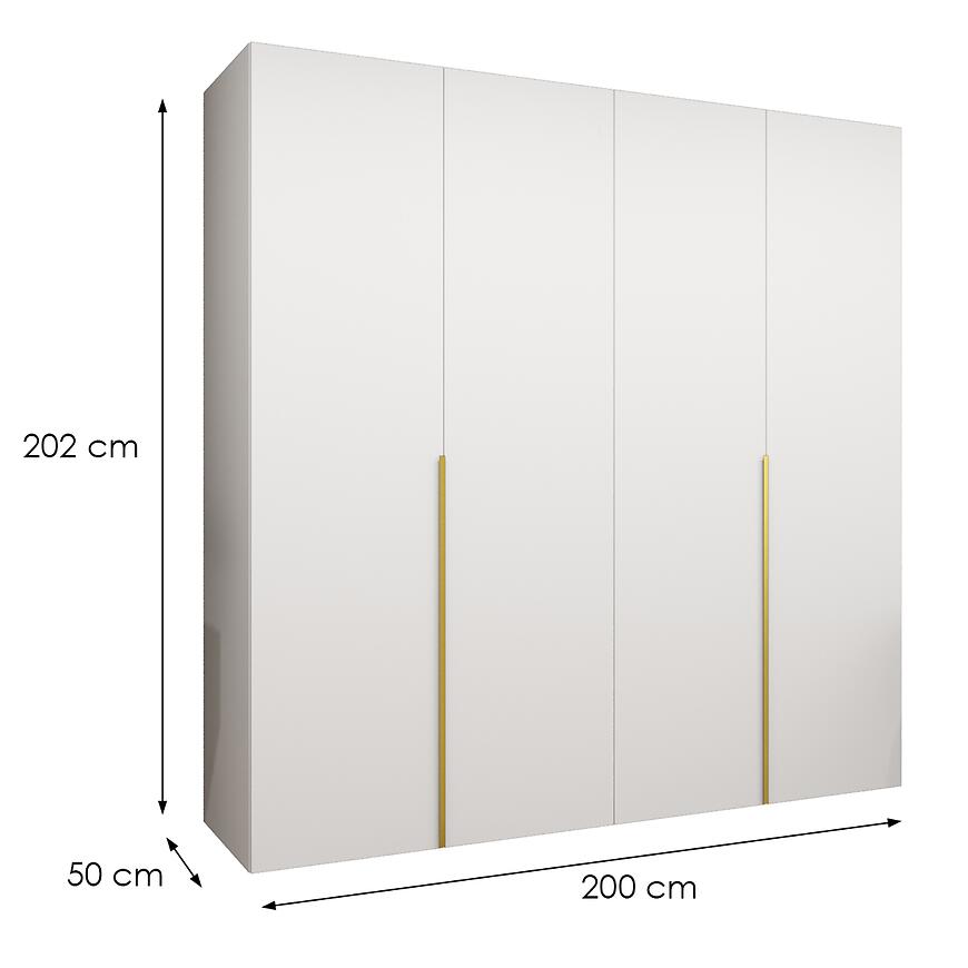 Szafa Alicante I 200 biały/złoty to propozycja dla osób poszukujących pojemnej i estetycznej szafy do nowoczesnych wnętrz. Szerokość 200 cm, wysokość 202 cm oraz głębokość 50 cm sprawiają, że mebel doskonale sprawdzi się zarówno w sypialni, jak i w garderobie czy przestronnym przedpokoju. Prosta bryła i matowe wykończenie podkreślają nowoczesny styl, dzięki czemu szafa Alicante I 200 harmonijnie wpisuje się w aktualne trendy aranżacyjne. To szafa 4-drzwiowa z klasycznymi drzwiami, zaprojektowana z myślą o wygodnym przechowywaniu odzieży i dodatków, bez zbędnych elementów wizualnych, takich jak lustro.