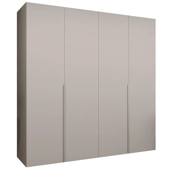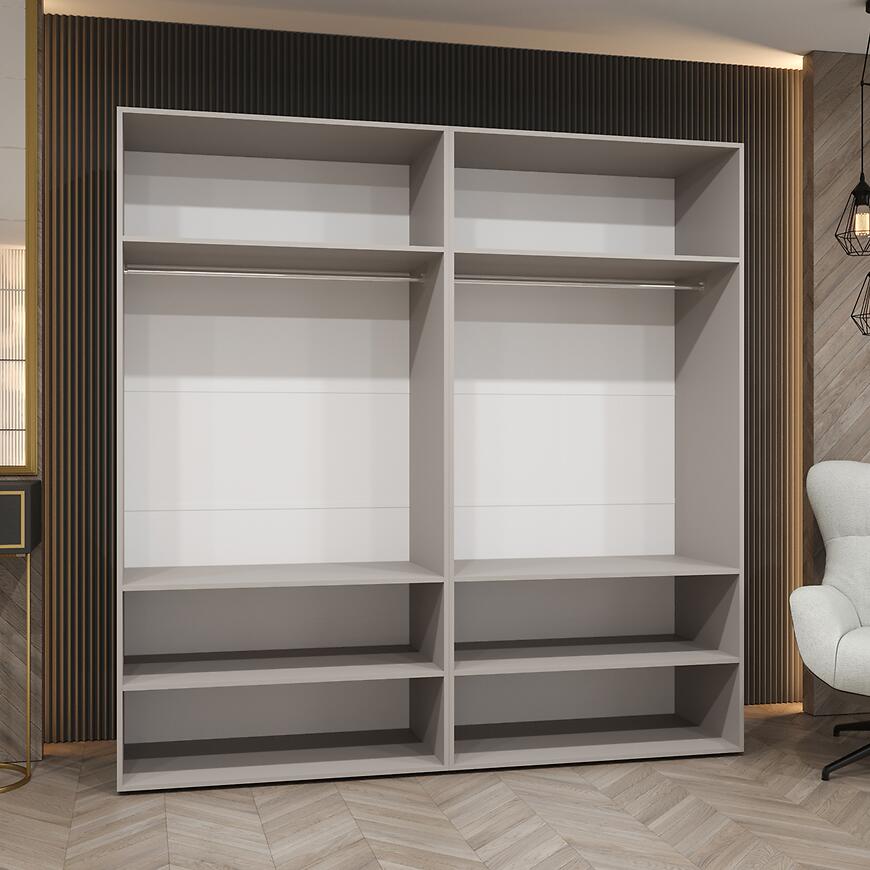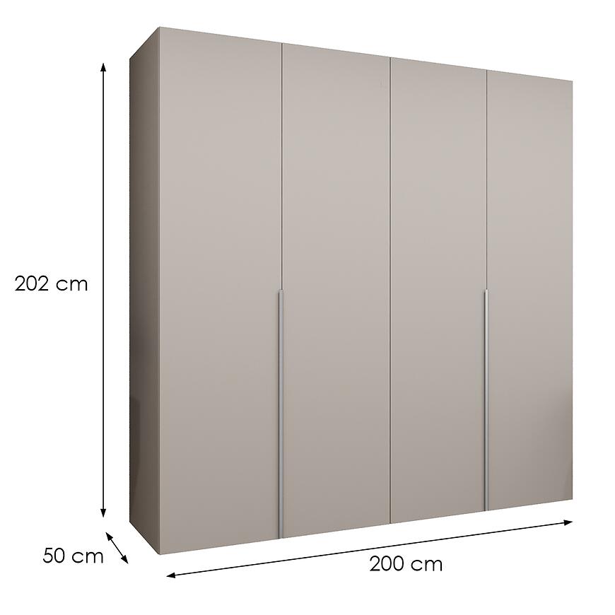 Szafa Alicante I 200 kaszmir/srebrny to propozycja dla osób poszukujących pojemnej i estetycznej szafy do nowoczesnych wnętrz. Szerokość 200 cm, wysokość 202 cm oraz głębokość 50 cm sprawiają, że mebel doskonale sprawdzi się zarówno w sypialni, jak i w garderobie czy przestronnym przedpokoju. Prosta bryła i matowe wykończenie podkreślają nowoczesny styl, dzięki czemu szafa Alicante I 200 harmonijnie wpisuje się w aktualne trendy aranżacyjne. To szafa 4-drzwiowa z klasycznymi drzwiami, zaprojektowana z myślą o wygodnym przechowywaniu odzieży i dodatków, bez zbędnych elementów wizualnych, takich jak lustro.