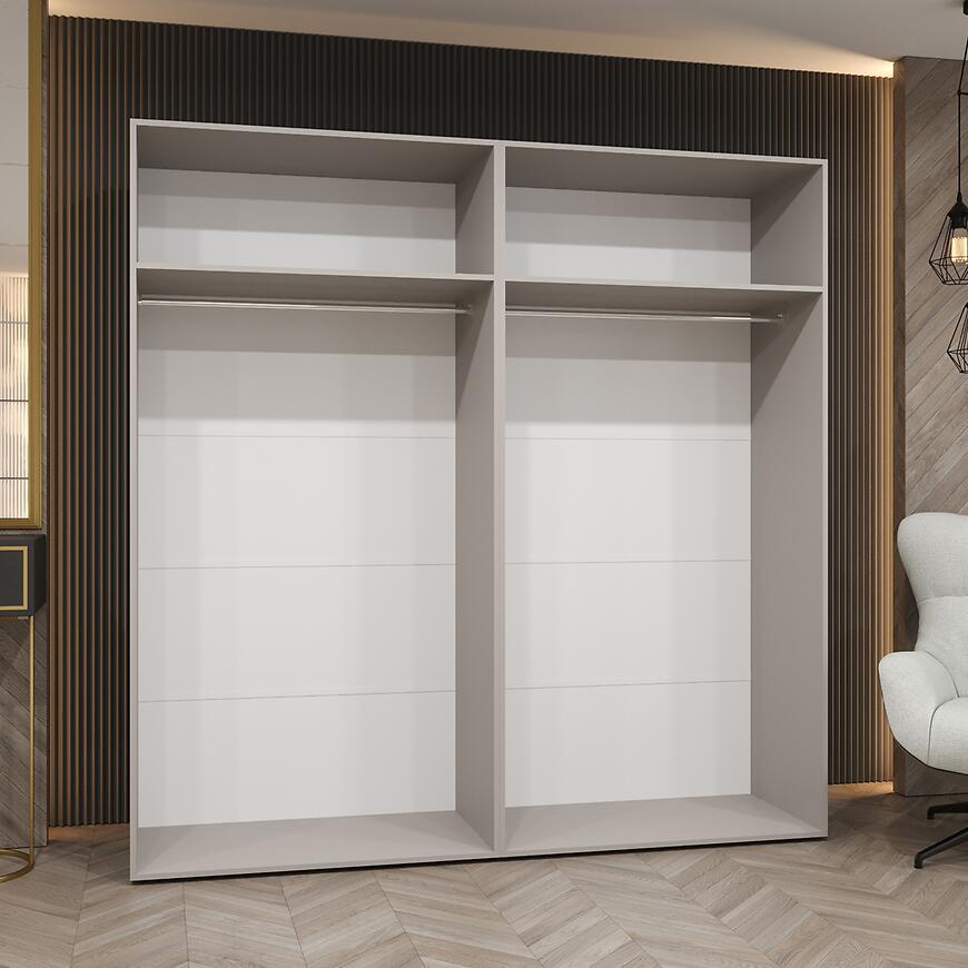 Szafa Alicante I 200 to szafa bez lustra, co pozwala zachować jednolitą i spokojną kompozycję wnętrza. Matowa powierzchnia frontów nadaje meblowi elegancki wygląd i ogranicza widoczność odcisków palców, co jest szczególnie istotne przy codziennym użytkowaniu. Proste linie i geometryczna forma sprawiają, że szafa doskonale komponuje się z innymi meblami w stylu nowoczesnym. To idealny wybór dla osób, które cenią uporządkowaną przestrzeń i chcą uniknąć nadmiaru dekoracyjnych detali. Szafa 200 cm szerokości daje możliwość przechowywania dużej ilości ubrań, zachowując jednocześnie wizualną lekkość bryły.