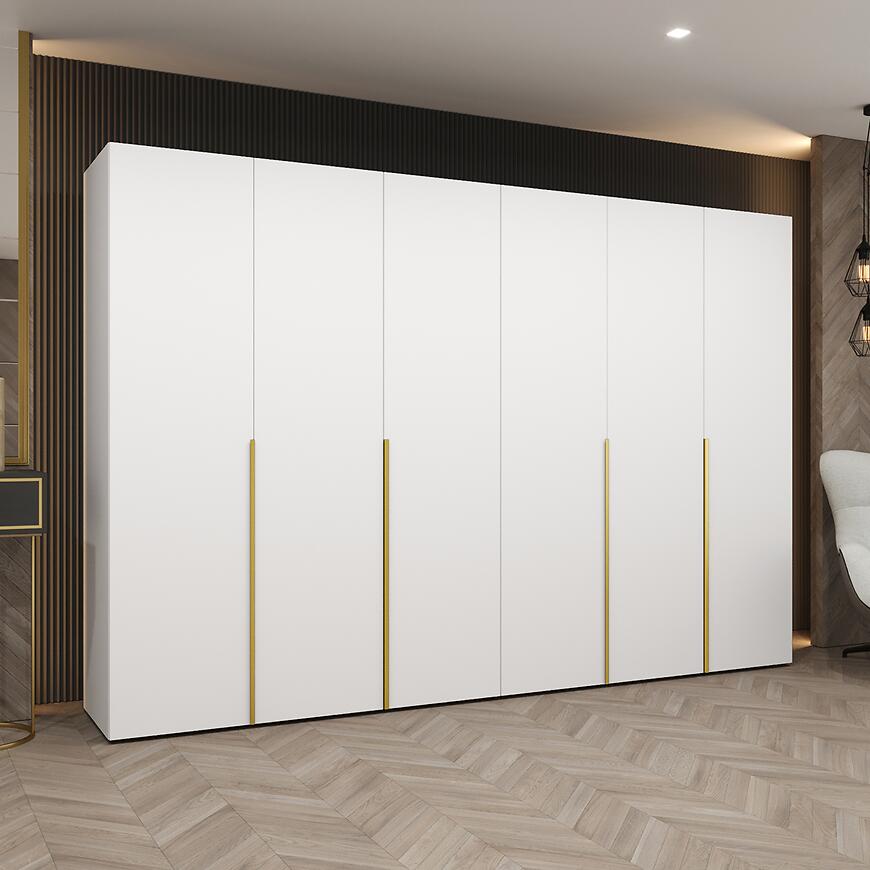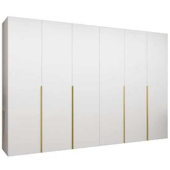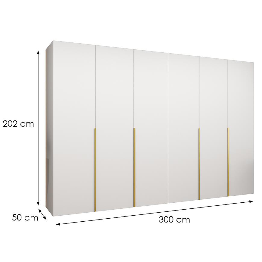 Szafa Alicante I 300 biały/złoty to propozycja dla osób, które poszukują dużej, estetycznej i dobrze zaprojektowanej szafy do sypialni, garderoby lub przestronnego przedpokoju. Szerokość 300 cm zapewnia bardzo dużą przestrzeń do przechowywania odzieży, dodatków i tekstyliów domowych, co czyni ten model doskonałym wyborem do wnętrz, w których liczy się porządek oraz ergonomiczne zagospodarowanie miejsca. Prosta bryła i nowoczesny styl sprawiają, że szafa Alicante I 300 dobrze komponuje się zarówno z jasnymi, jak i ciemniejszymi aranżacjami wnętrz.