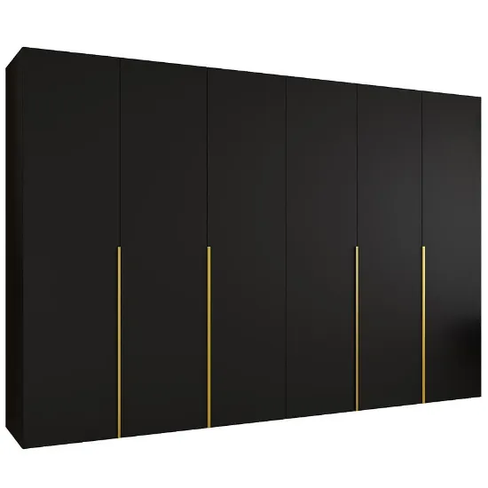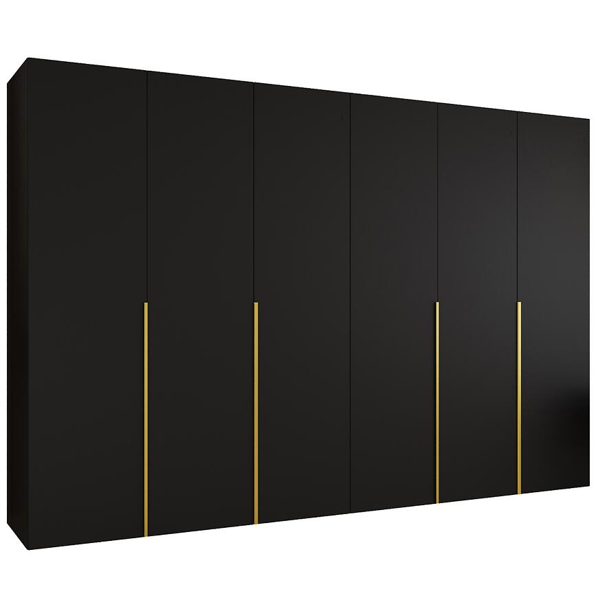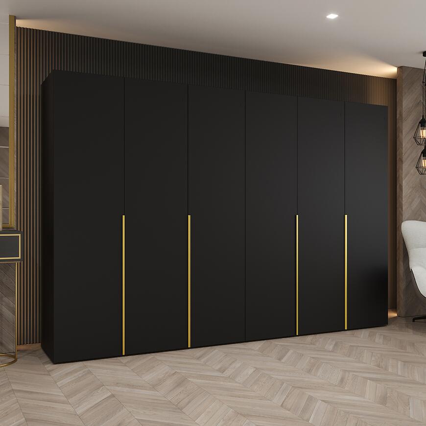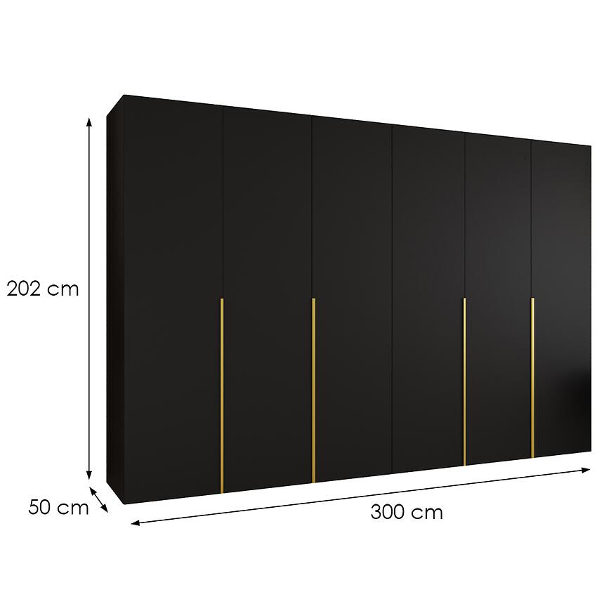 Szafa Alicante I 300 czarny/złoty to propozycja dla osób, które poszukują dużej, estetycznej i dobrze zaprojektowanej szafy do sypialni, garderoby lub przestronnego przedpokoju. Szerokość 300 cm zapewnia bardzo dużą przestrzeń do przechowywania odzieży, dodatków i tekstyliów domowych, co czyni ten model doskonałym wyborem do wnętrz, w których liczy się porządek oraz ergonomiczne zagospodarowanie miejsca. Prosta bryła i nowoczesny styl sprawiają, że szafa Alicante I 300 dobrze komponuje się zarówno z jasnymi, jak i ciemniejszymi aranżacjami wnętrz.