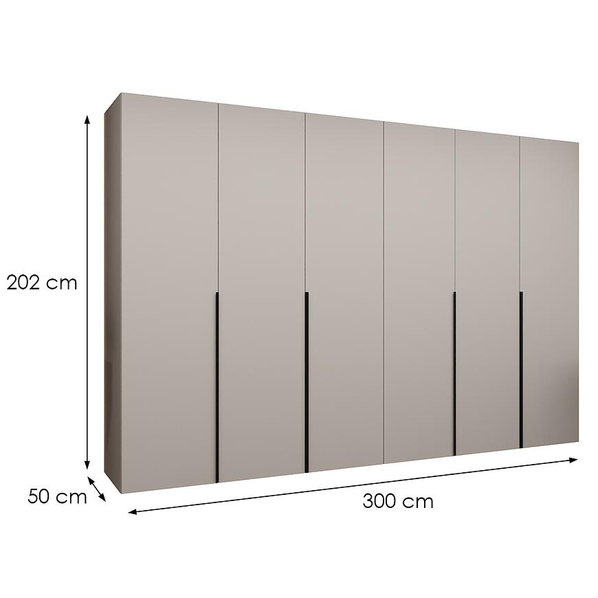 Szerokość 300 cm, wysokość 202 cm oraz głębokość 50 cm sprawiają, że szafa Alicante I 300 oferuje bardzo dużą pojemność przy zachowaniu komfortowej głębokości użytkowej. Takie proporcje umożliwiają wygodne przechowywanie ubrań wiszących, złożonych oraz akcesoriów, bez nadmiernego zajmowania przestrzeni w pomieszczeniu. Szafa 300 cm szerokości doskonale sprawdzi się w większych sypialniach, garderobach oraz nowoczesnych apartamentach, gdzie istotna jest duża ilość miejsca do przechowywania.
