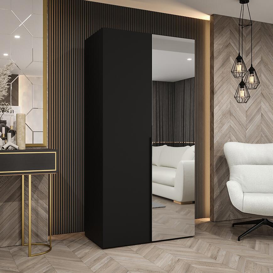 Szafa Alicante II 100 czarny to propozycja dla osób, które poszukują estetycznego i praktycznego mebla do przechowywania ubrań oraz dodatków. Dzięki szerokości 100 cm, wysokości 202 cm i głębokości 50 cm szafa doskonale sprawdzi się zarówno w sypialni, jak i w przedpokoju czy garderobie. Prosta bryła, klasyczne drzwi oraz nowoczesny styl sprawiają, że model z kolekcji ALICANTE łatwo dopasować do wielu aranżacji wnętrz. Zastosowanie lustra na froncie nie tylko podnosi walory wizualne mebla, ale również optycznie powiększa przestrzeń, co jest szczególnie istotne w mniejszych pomieszczeniach.
